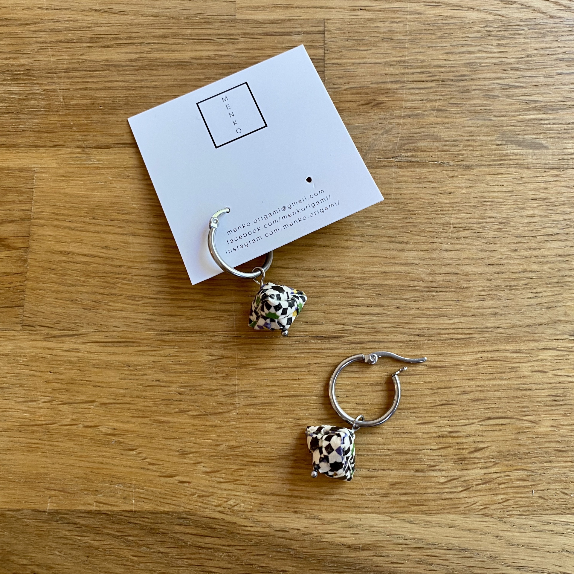 Argolas em aço inoxidável prateado e peças de origami modulares feitas com papel decorativo.