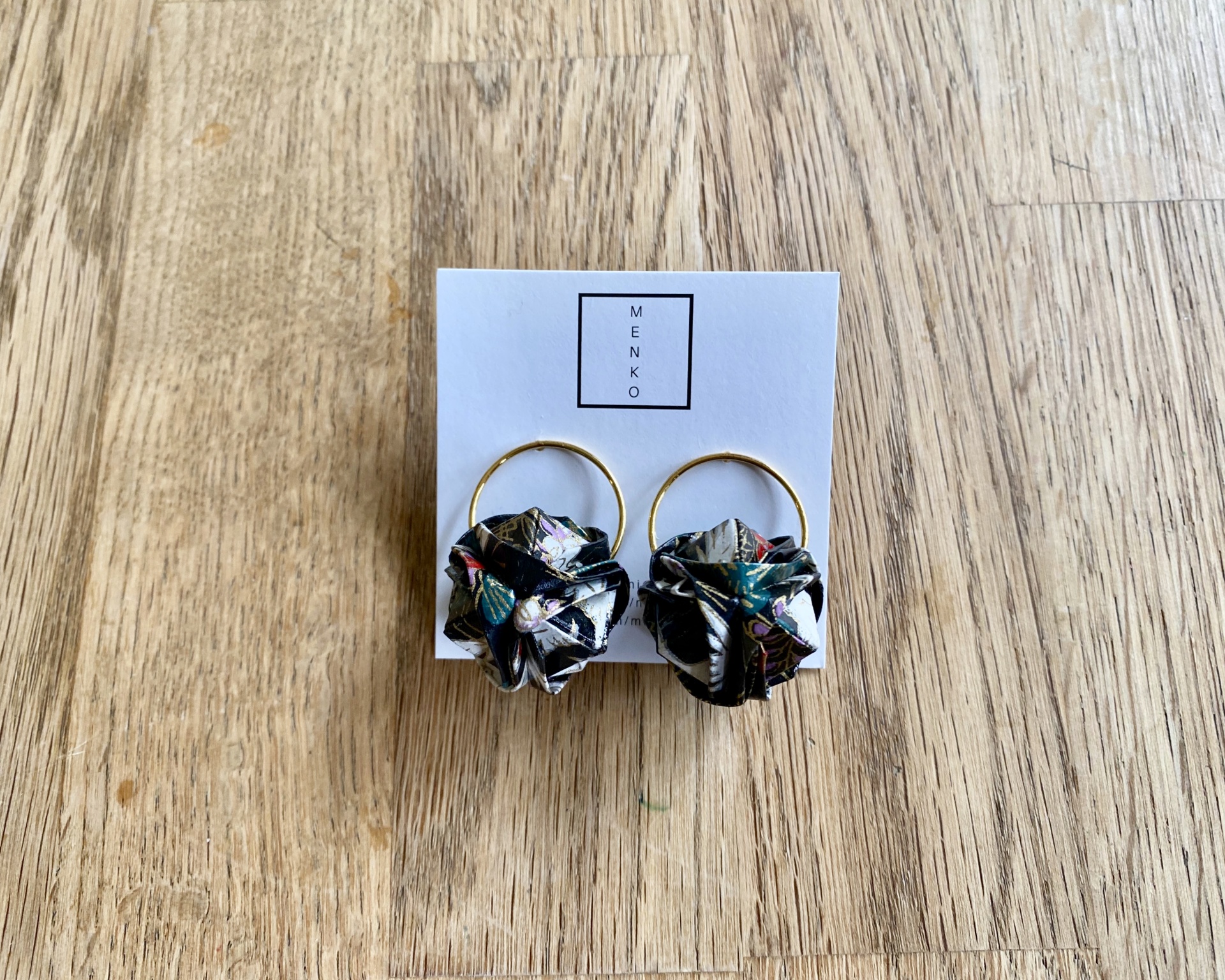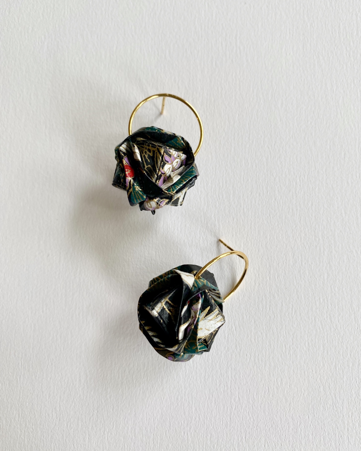 Brincos de espigão com argolas em prata dourada e peças de origami modulares com papel japonês.