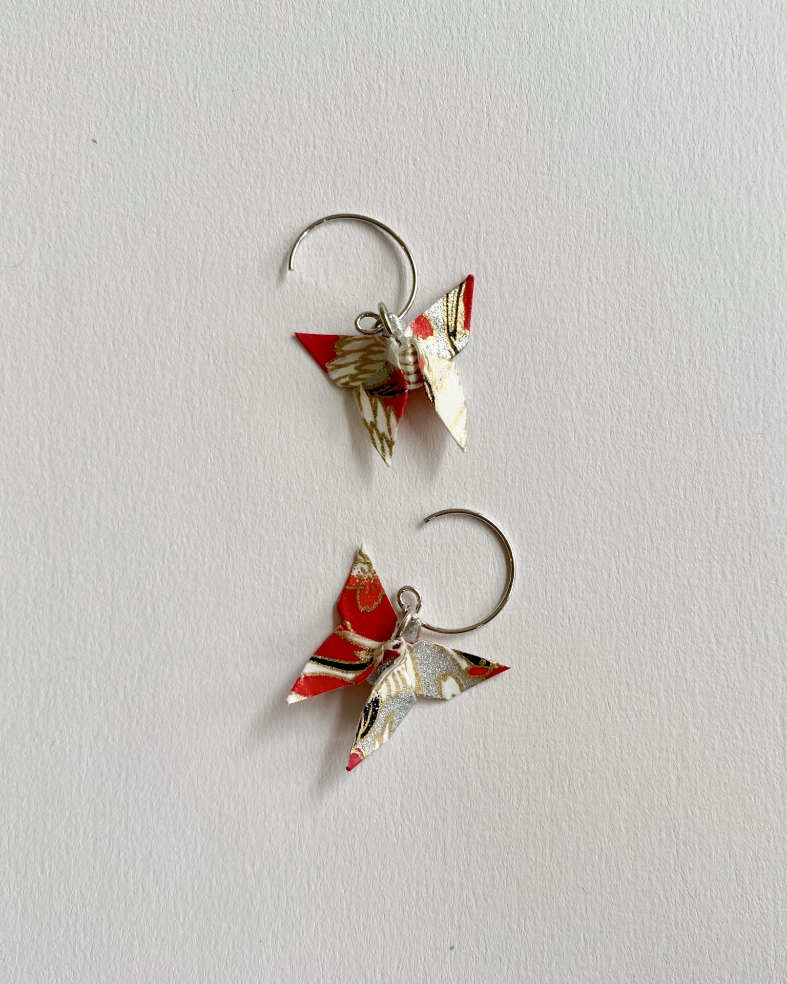 Brincos com borboleta em origami feito com papel japonês e peça em gancho em prata.
