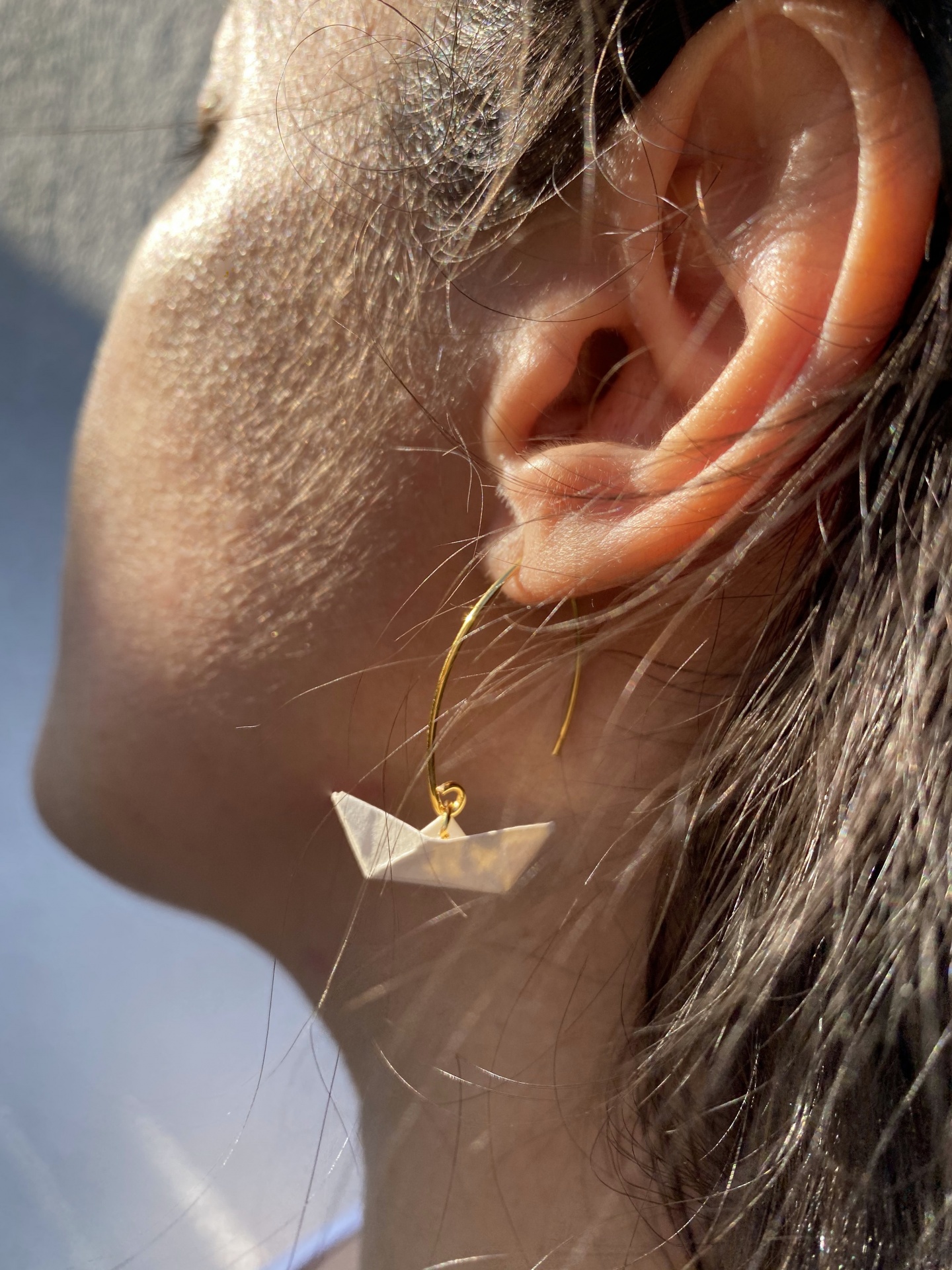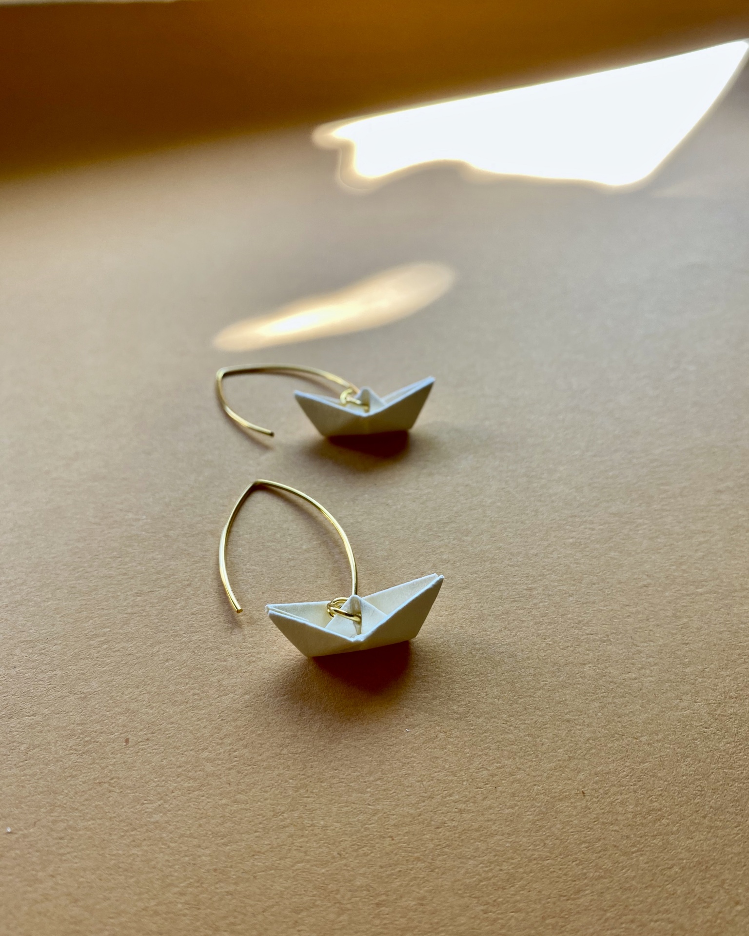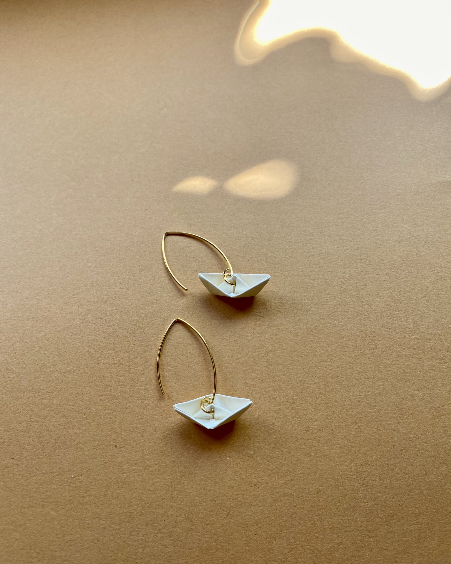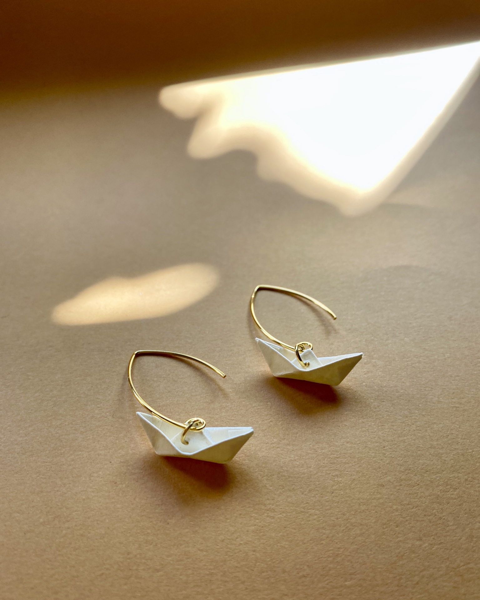 Brincos com gancho em prata dourada e barquinho em origami feito com papel branco pérola.