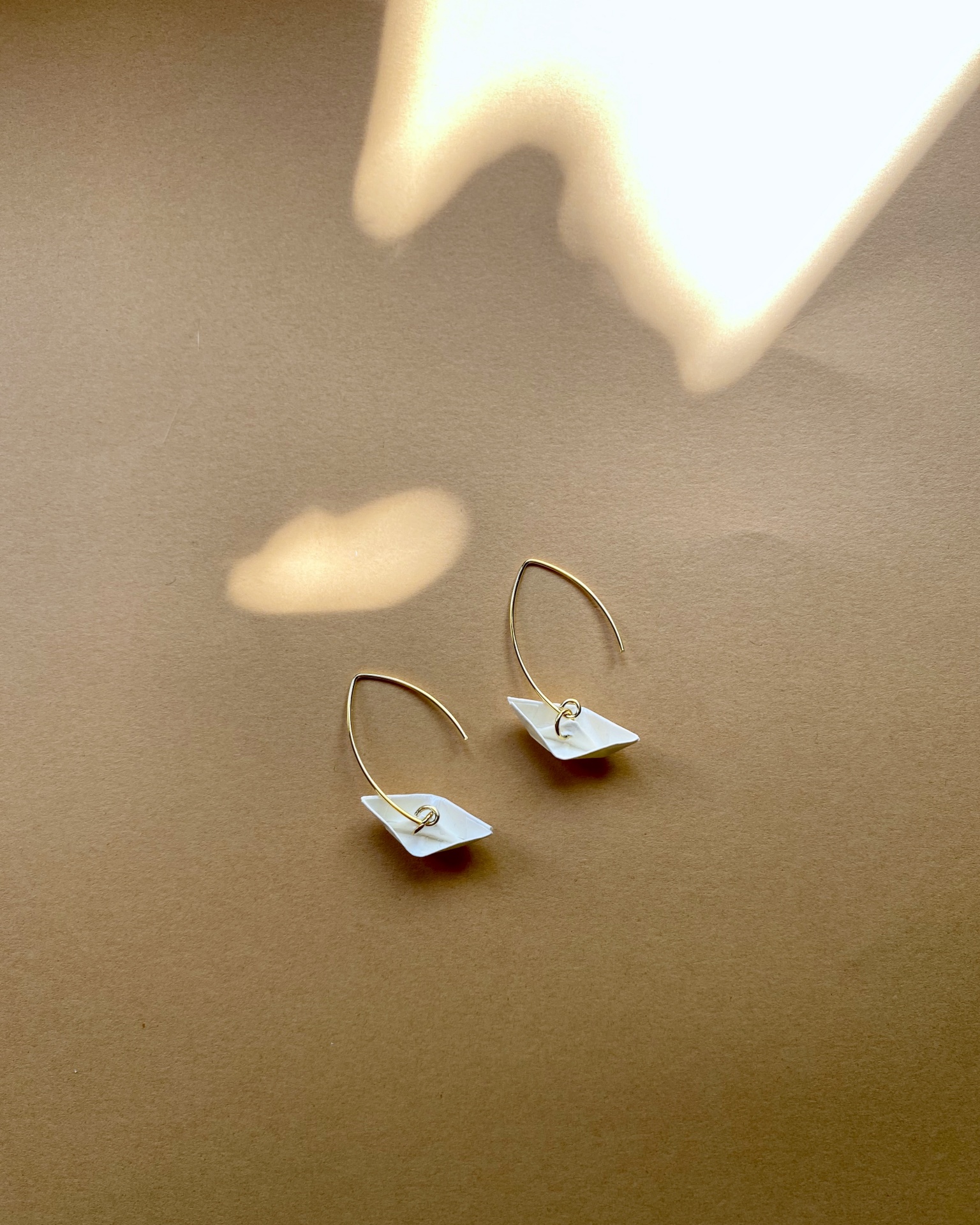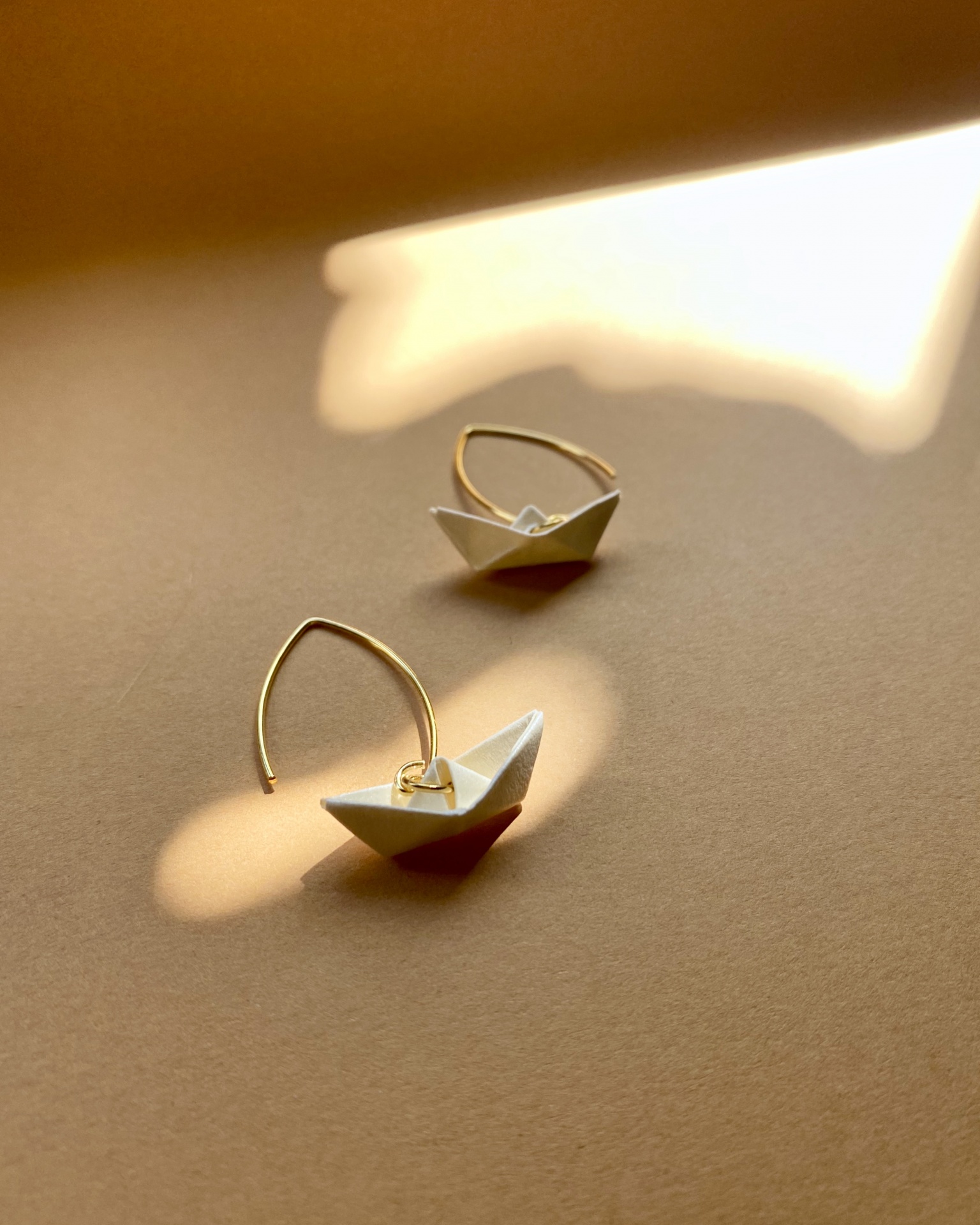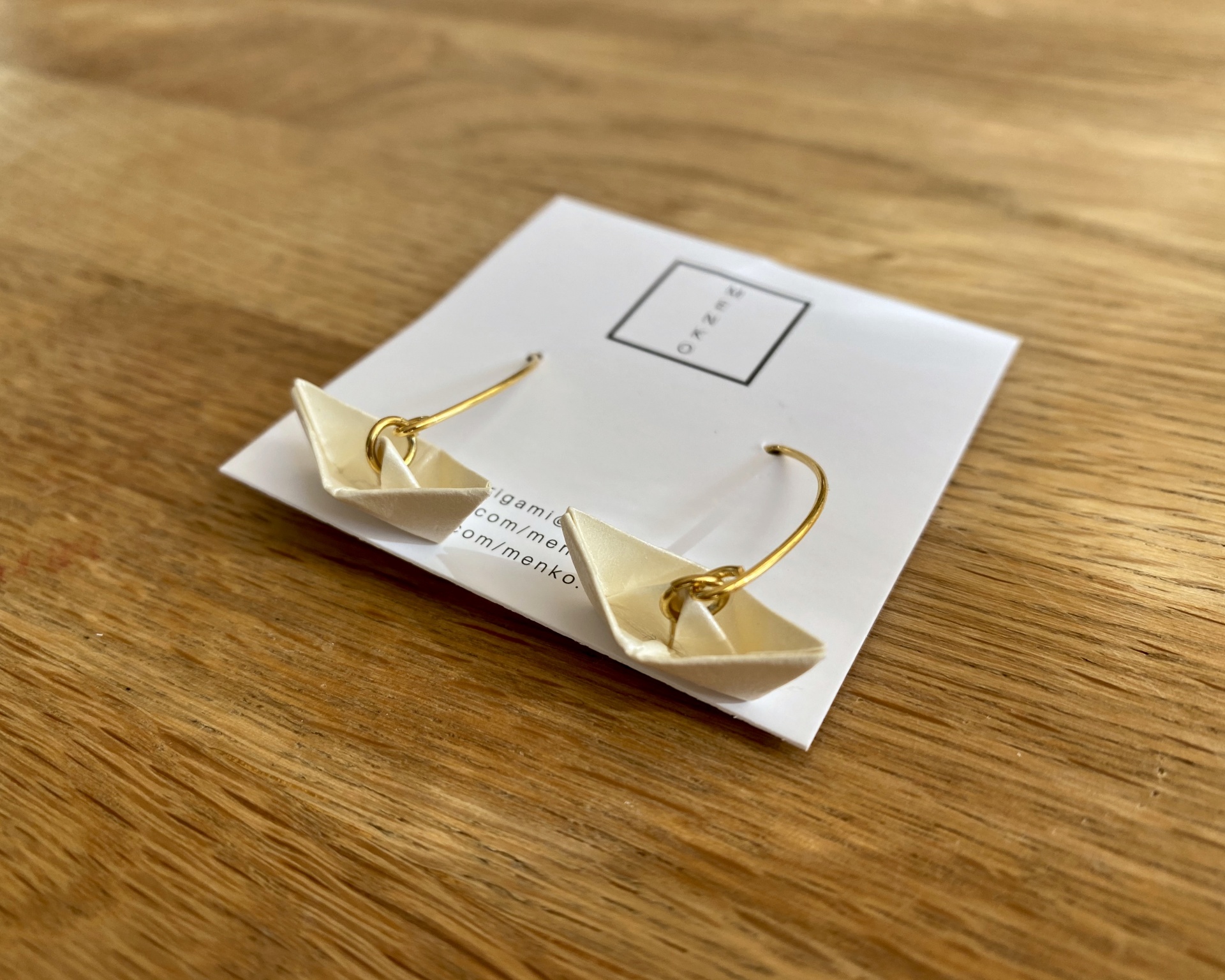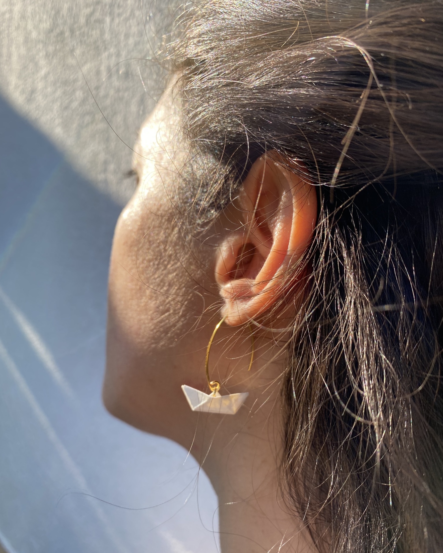Brincos com gancho em prata dourada e barquinho em origami feito com papel branco pérola.