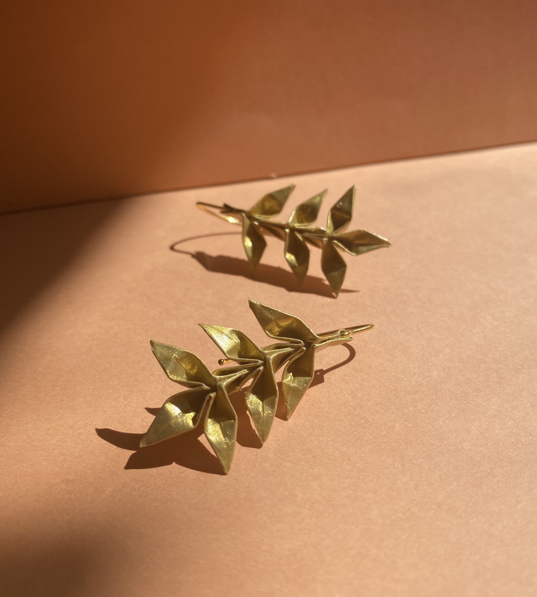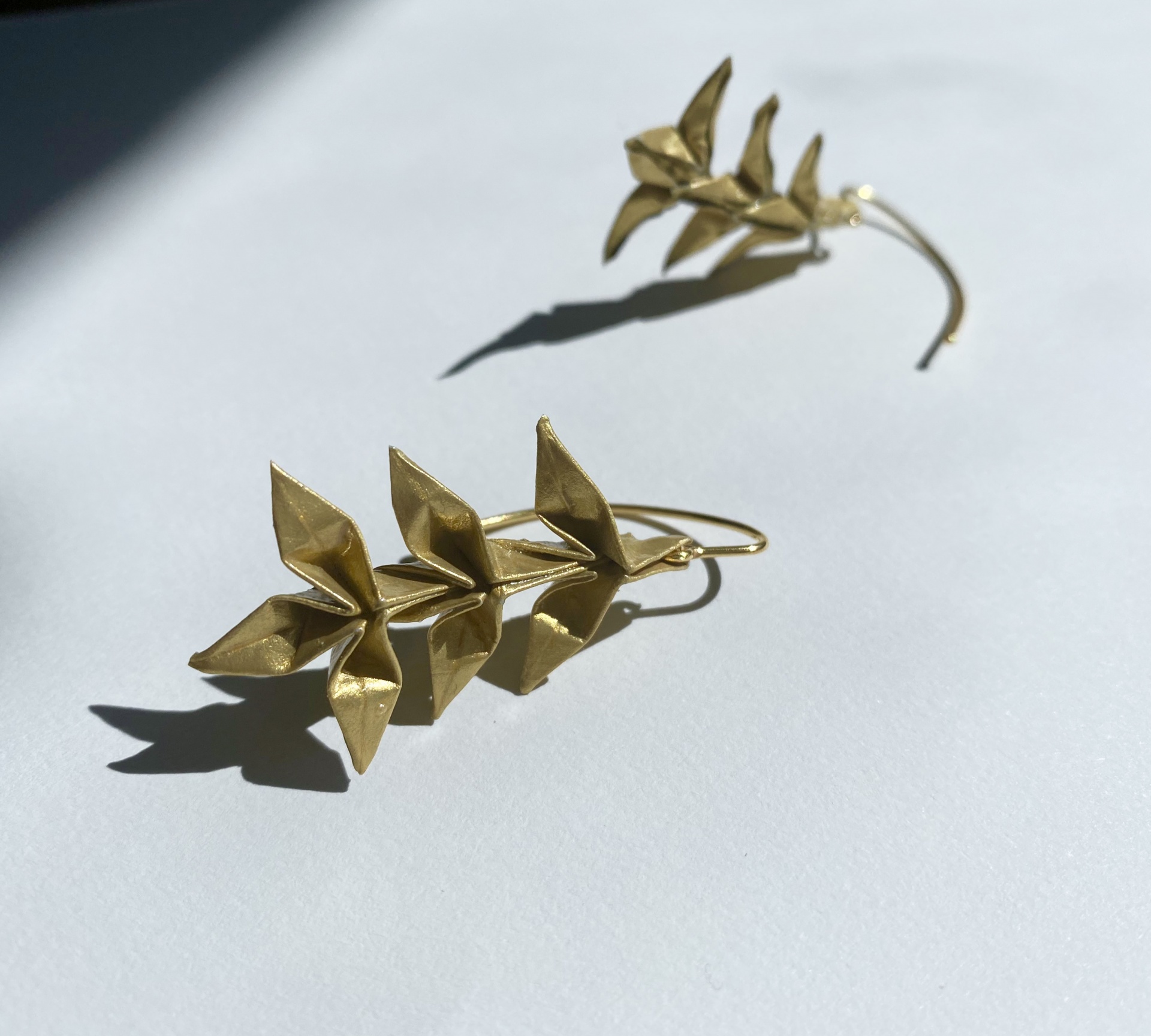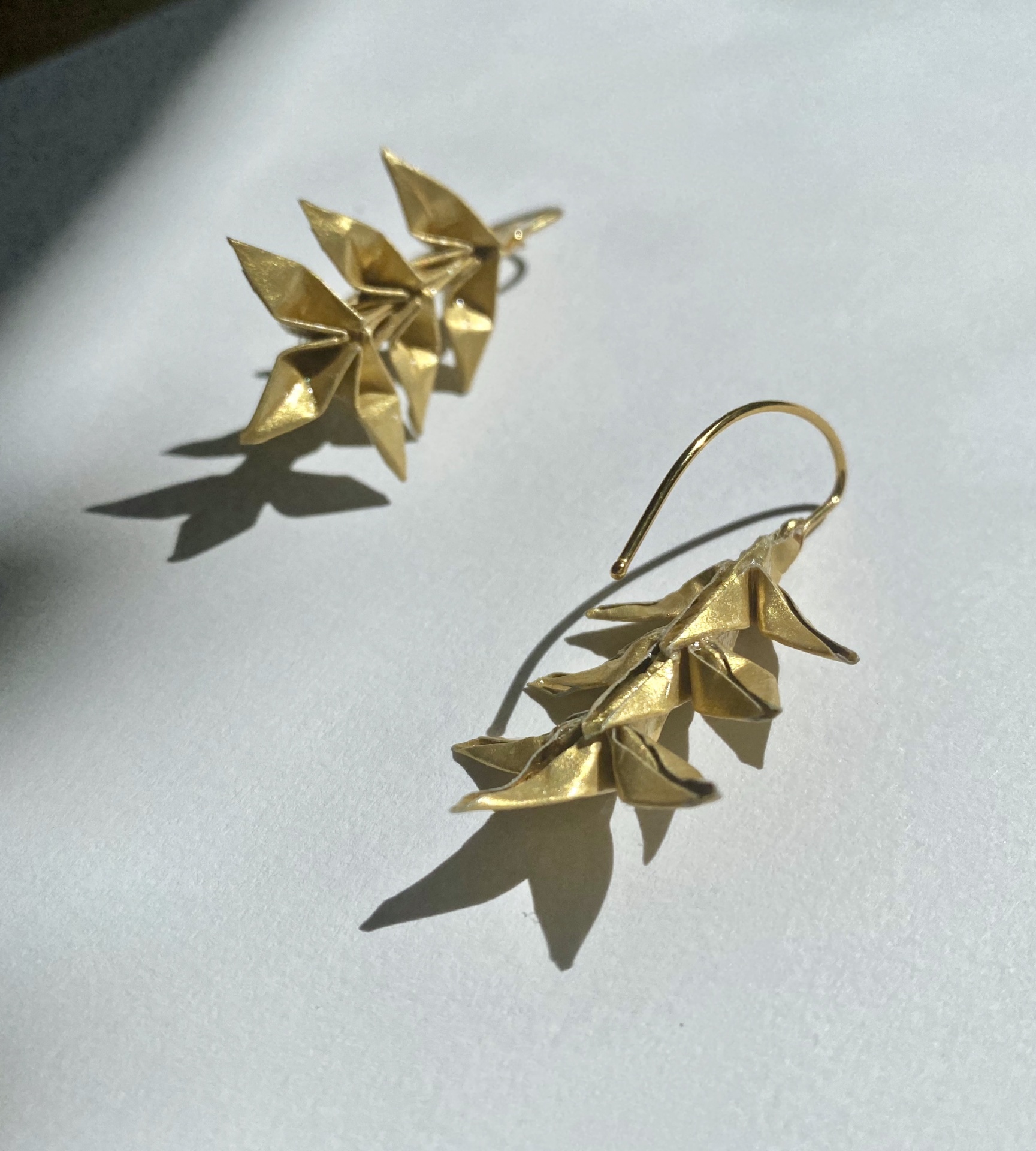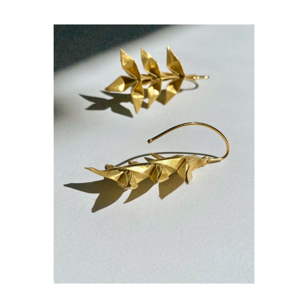 Brincos com gancho em prata banhada a ouro e espiga em origami feita com papel dourado.