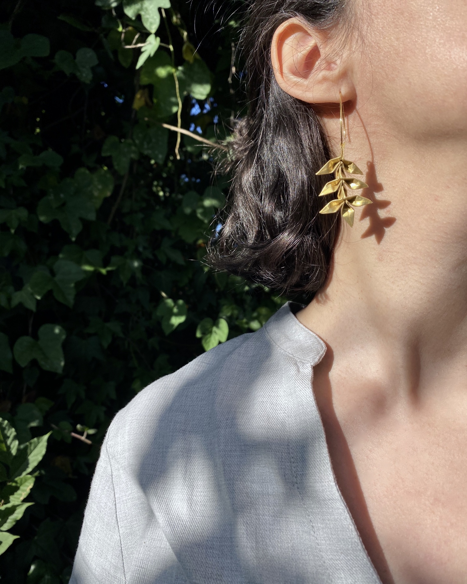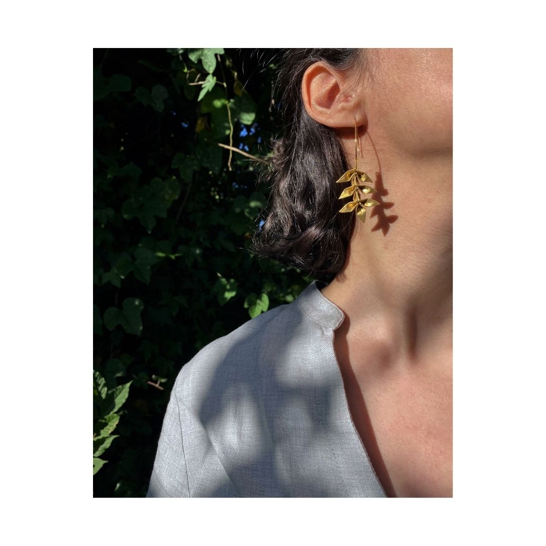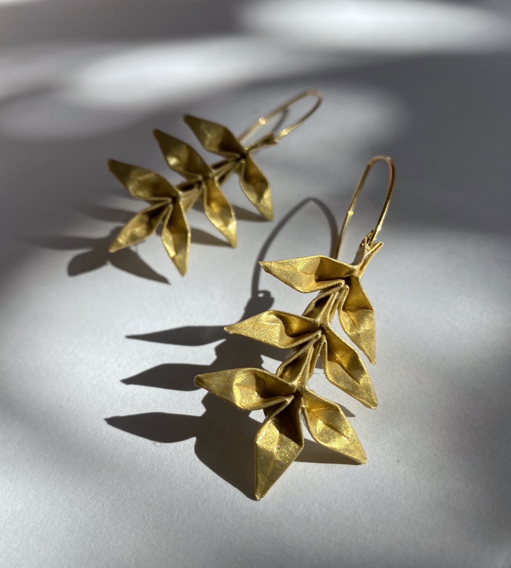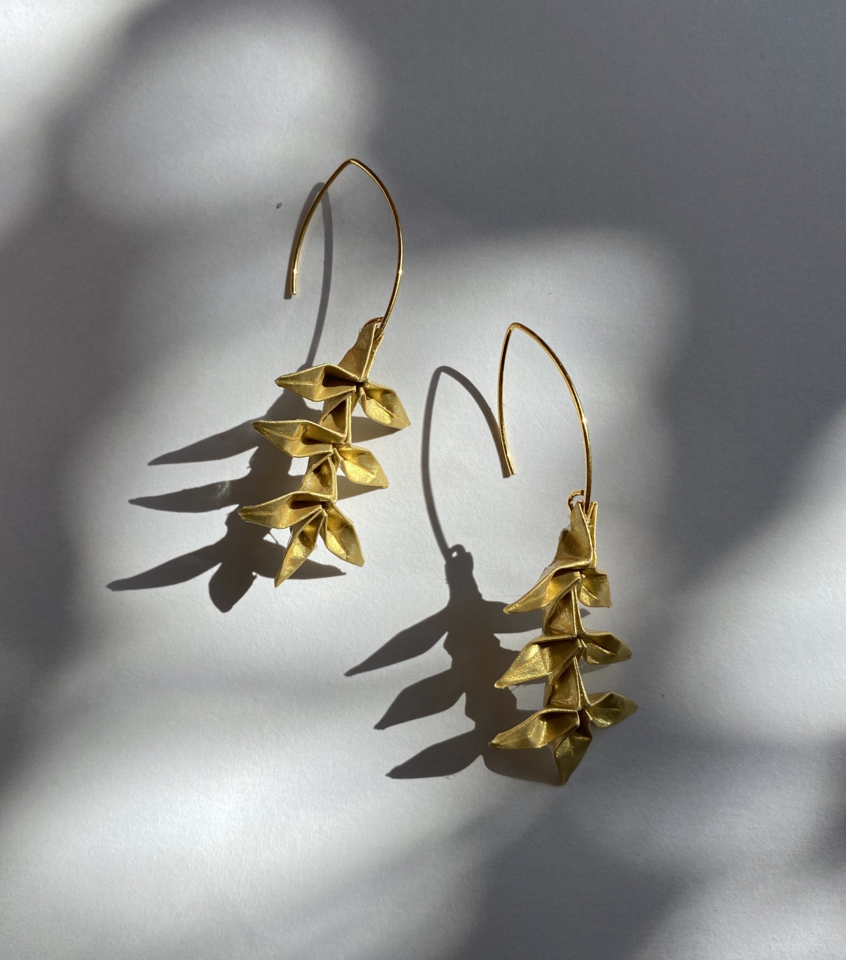 Brincos em gancho comprido em prata banhada a ouro e espiga em origami feita com papel dourado.