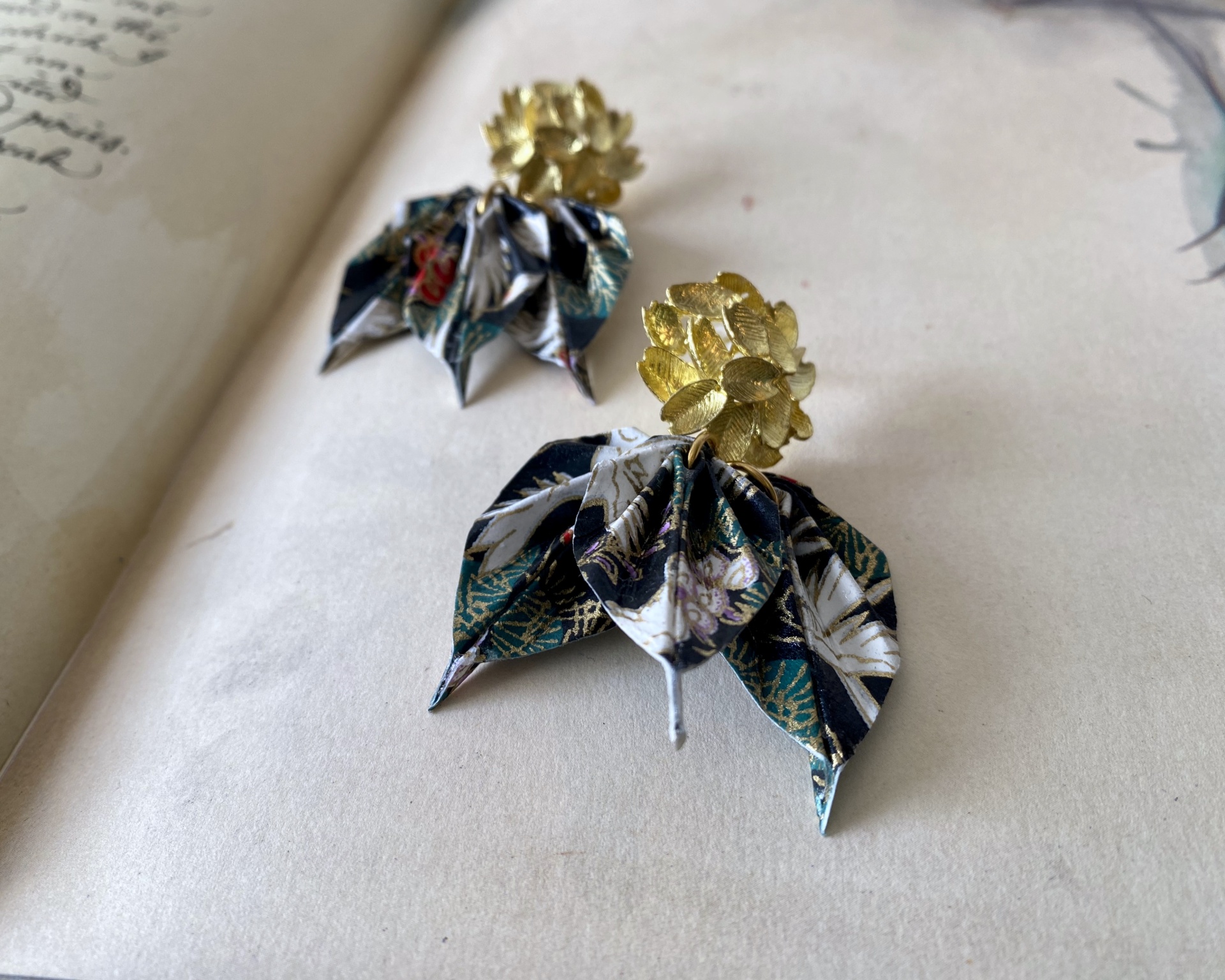 Brincos de espigão com peça em aço, pendente em cobre com motivos decorativos de folhagem e folhas em origami feitas com papel japonês.