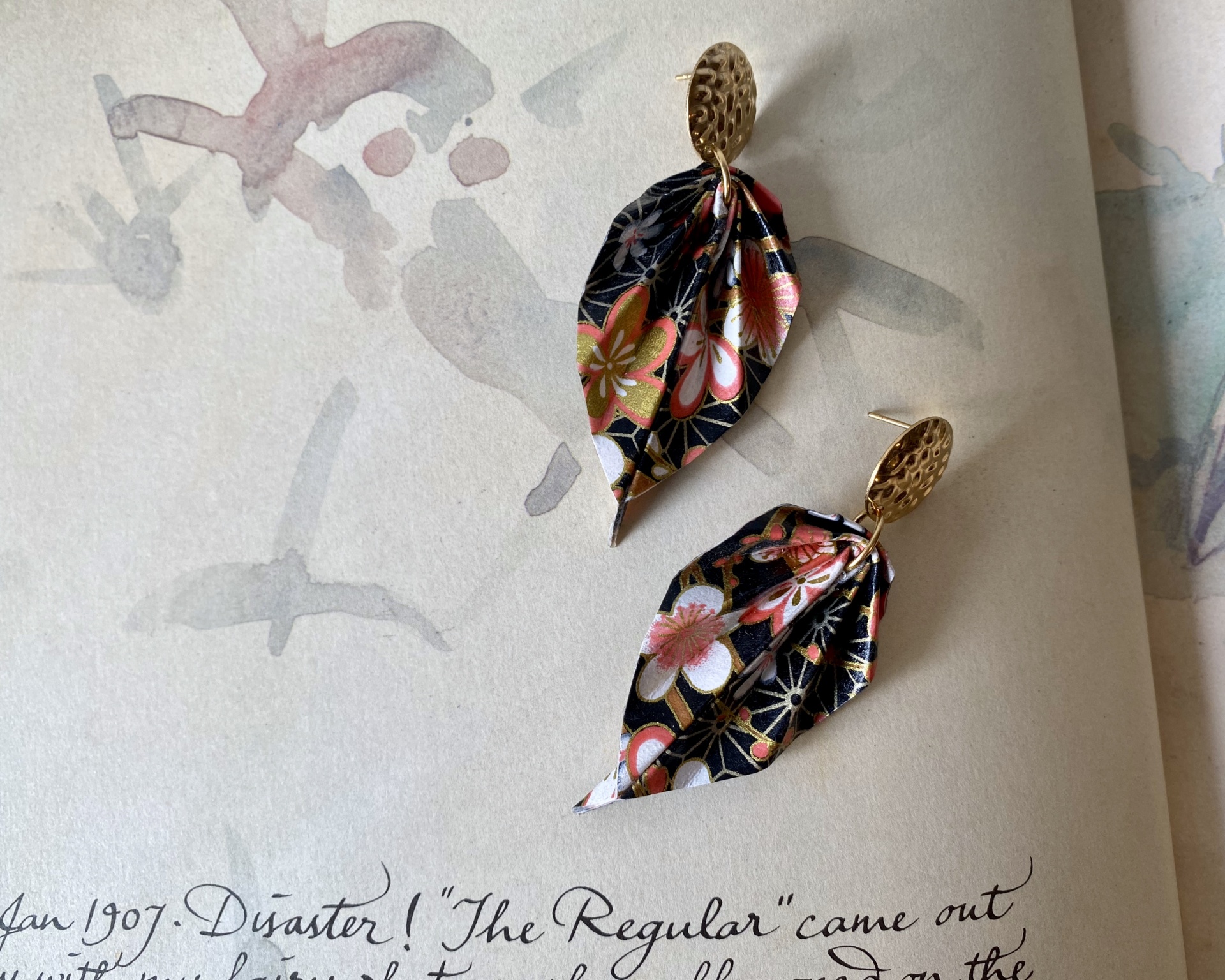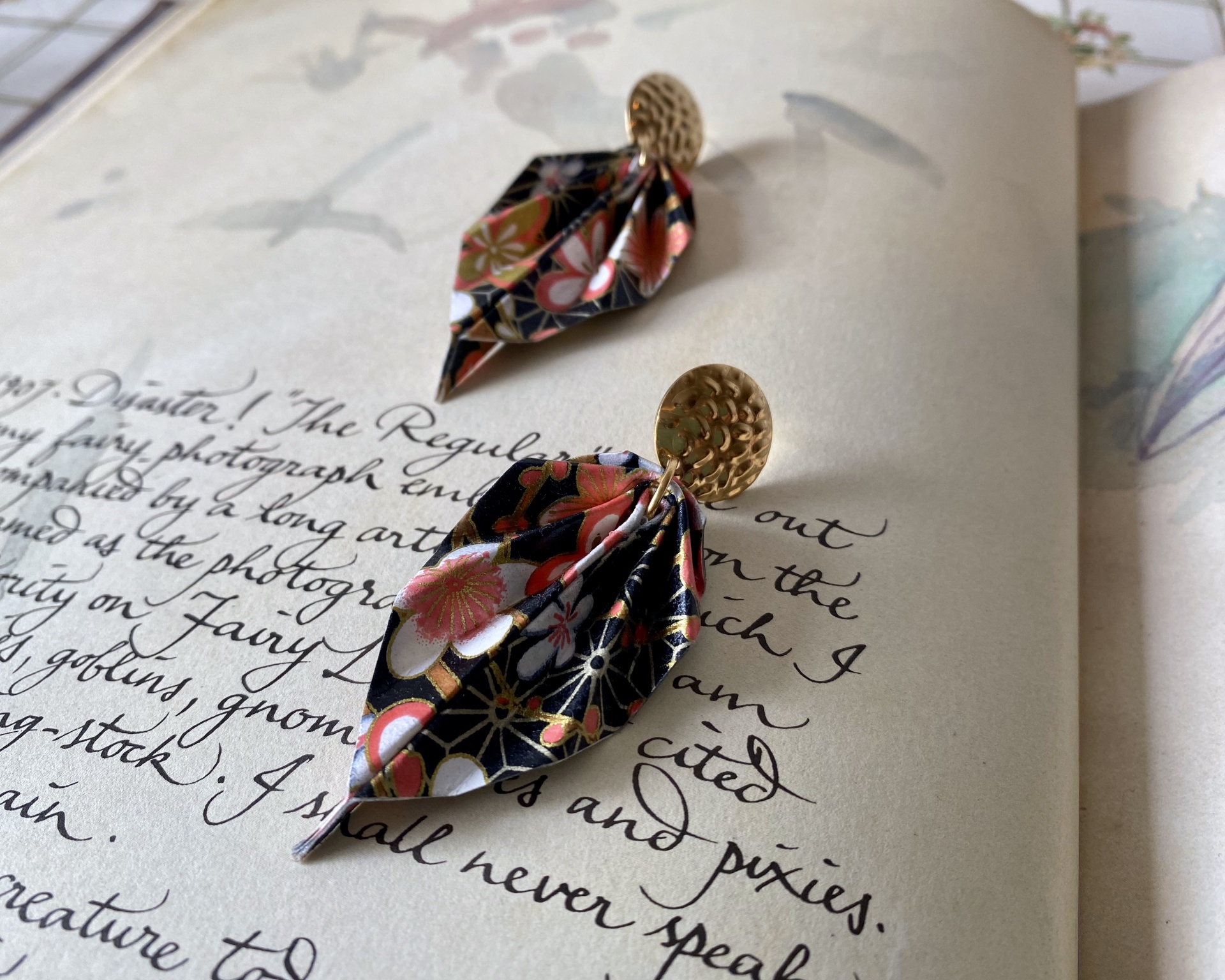 Brincos de espigão com peça em forma de medalha dourada e folha em origami feita com papel japonês.