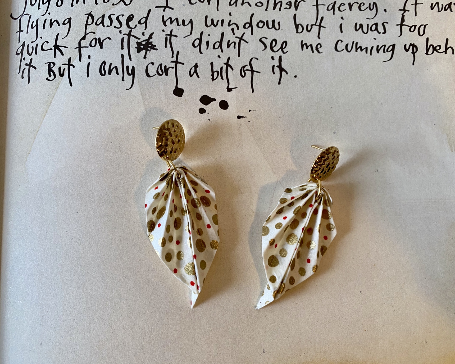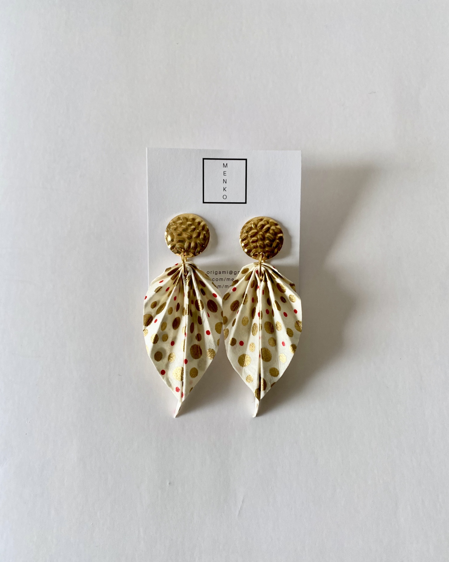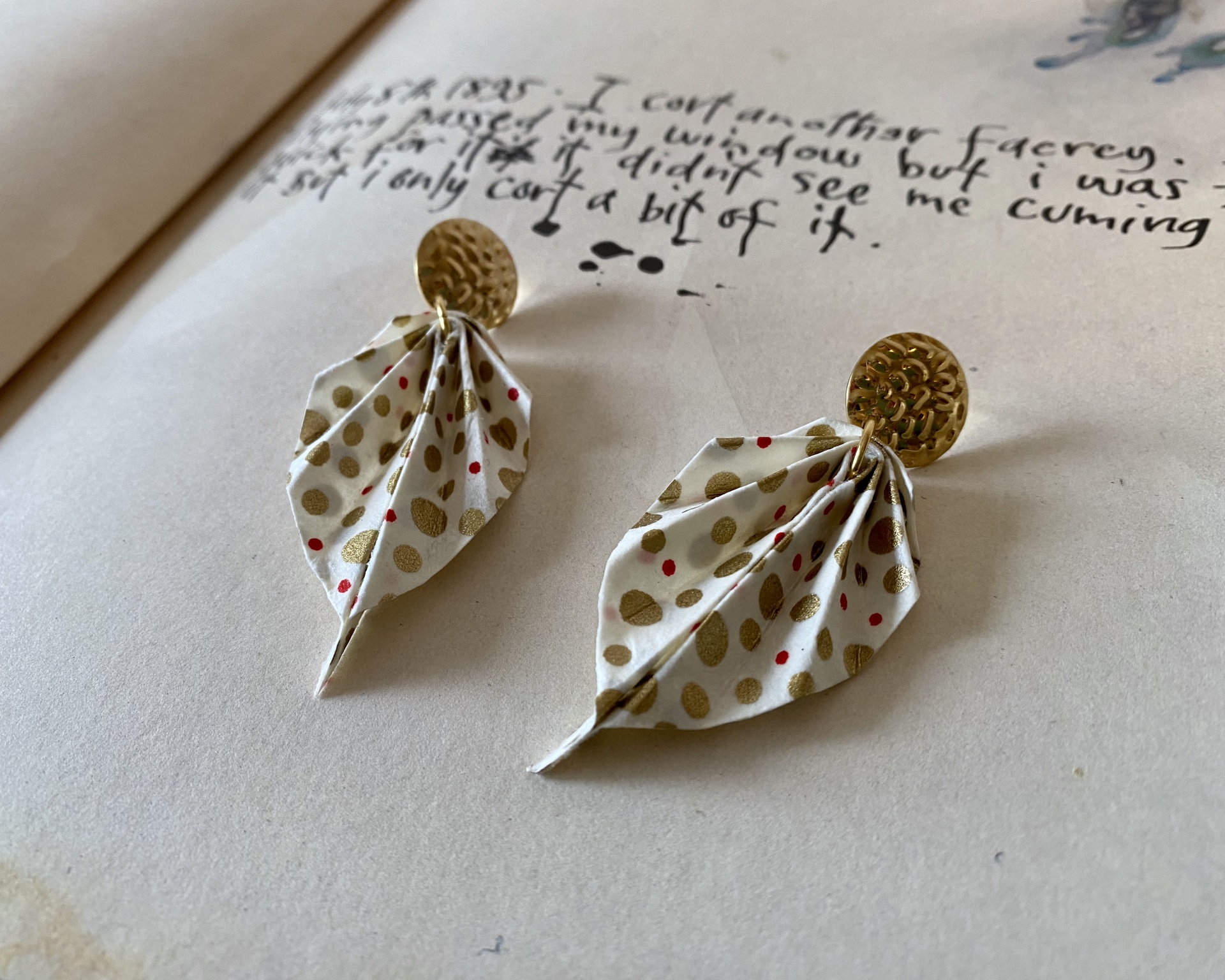 Brincos de espigão com peça em forma de medalha dourada e folha em origami feita com papel japonês.