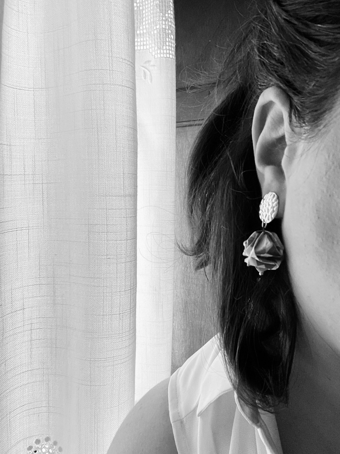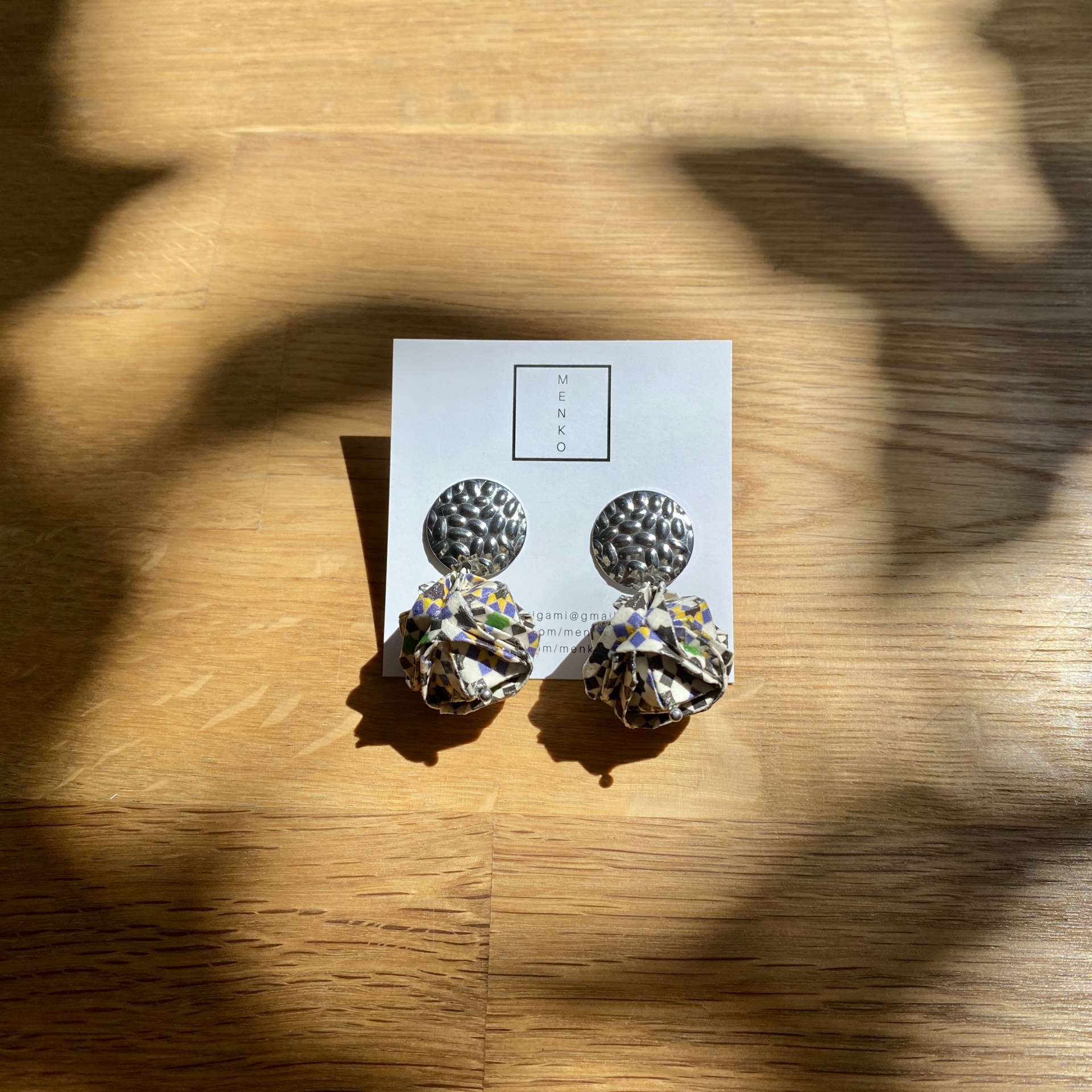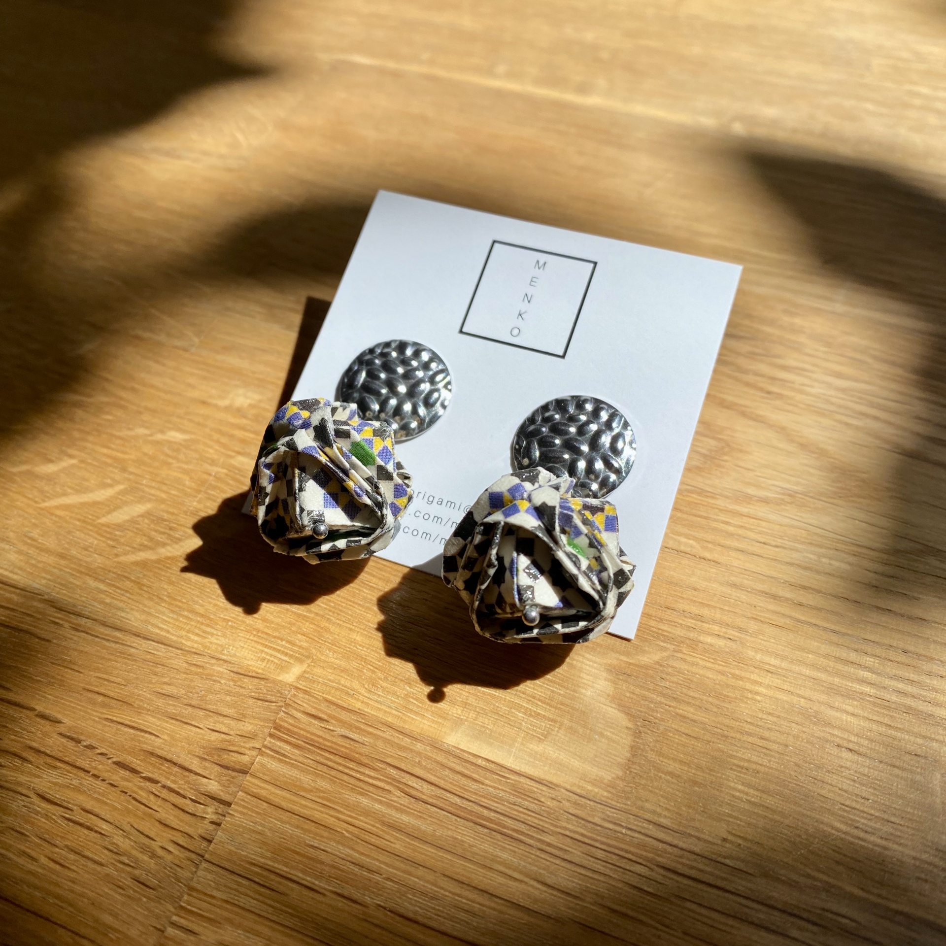 Brincos de espigão com peça em aço prateado e origami feito com papel decorativo.