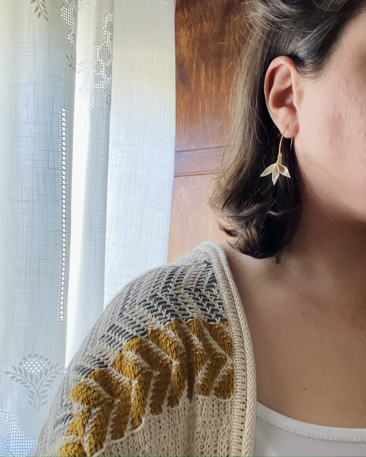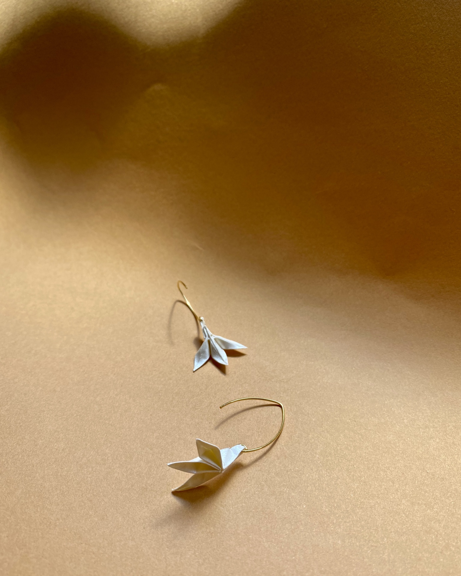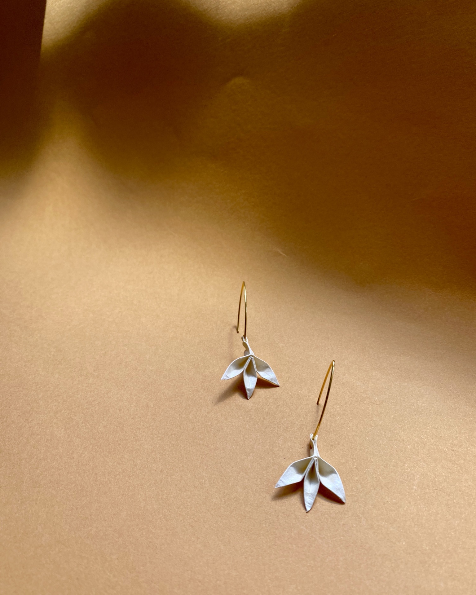 Brincos em gancho de prata banhada a ouro e flor em origami feita com papel branco pérola.