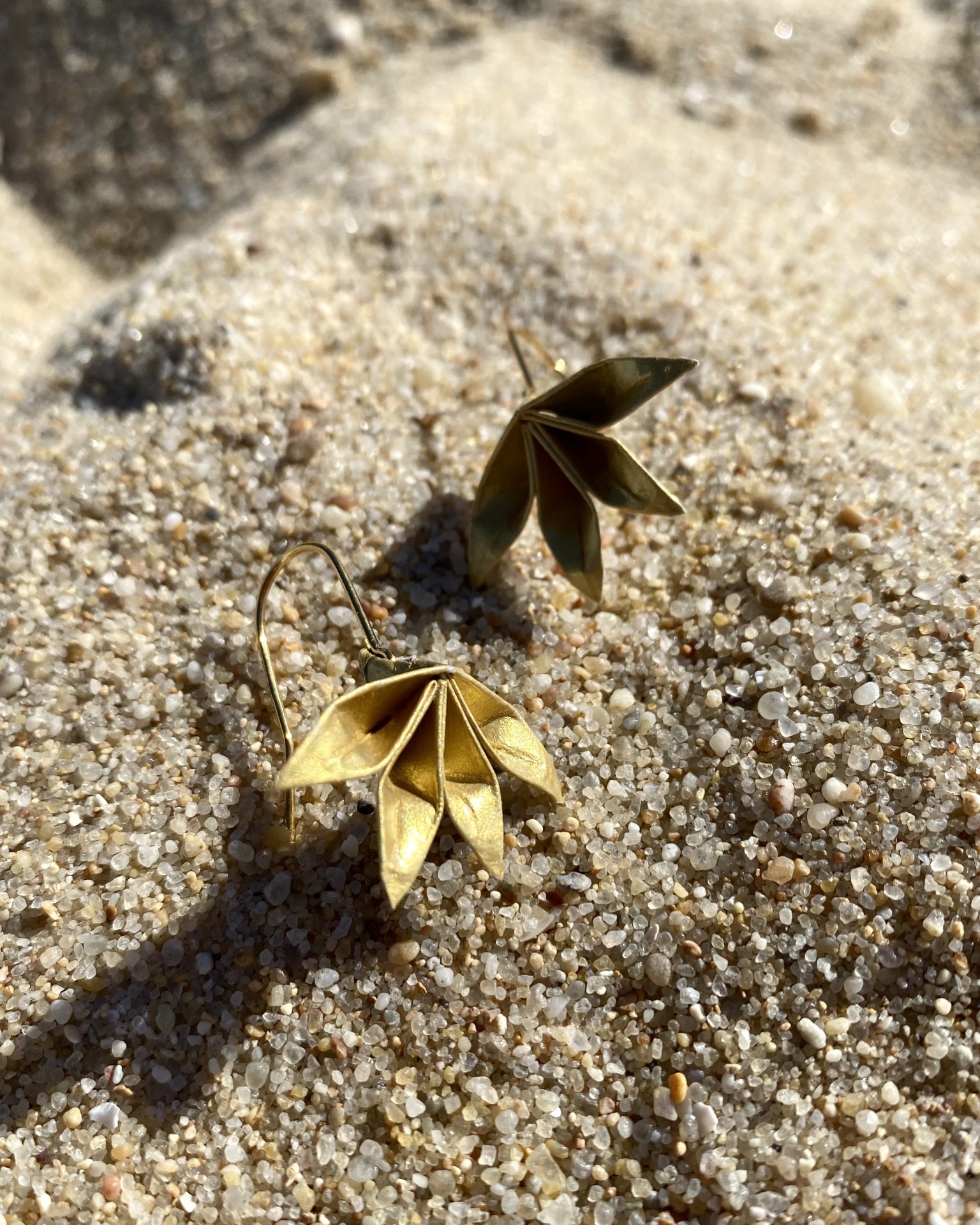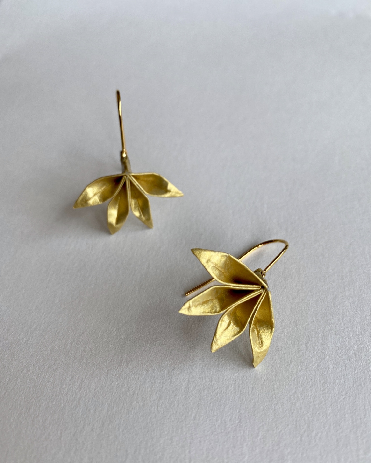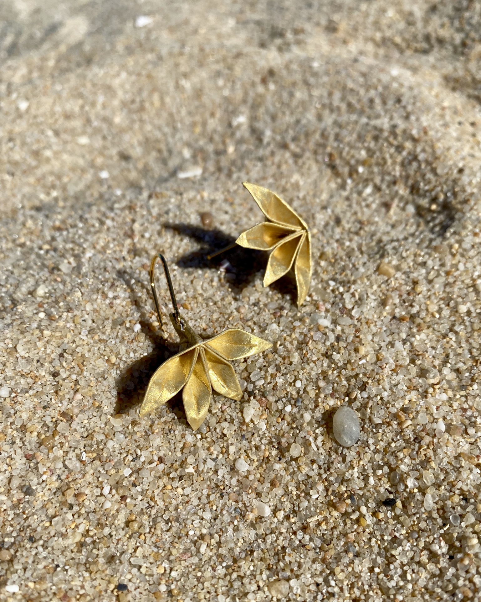 Brincos em gancho de prata banhada a ouro e flor em origami feita com papel dourado.