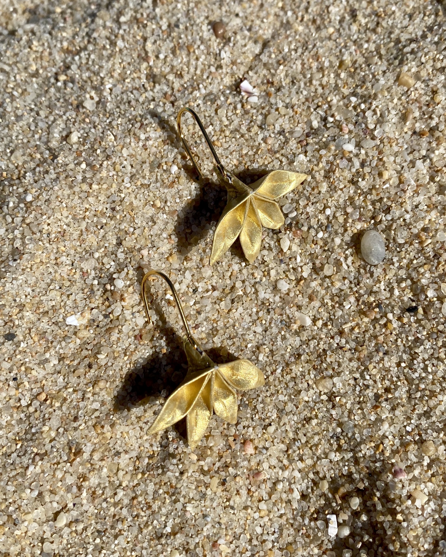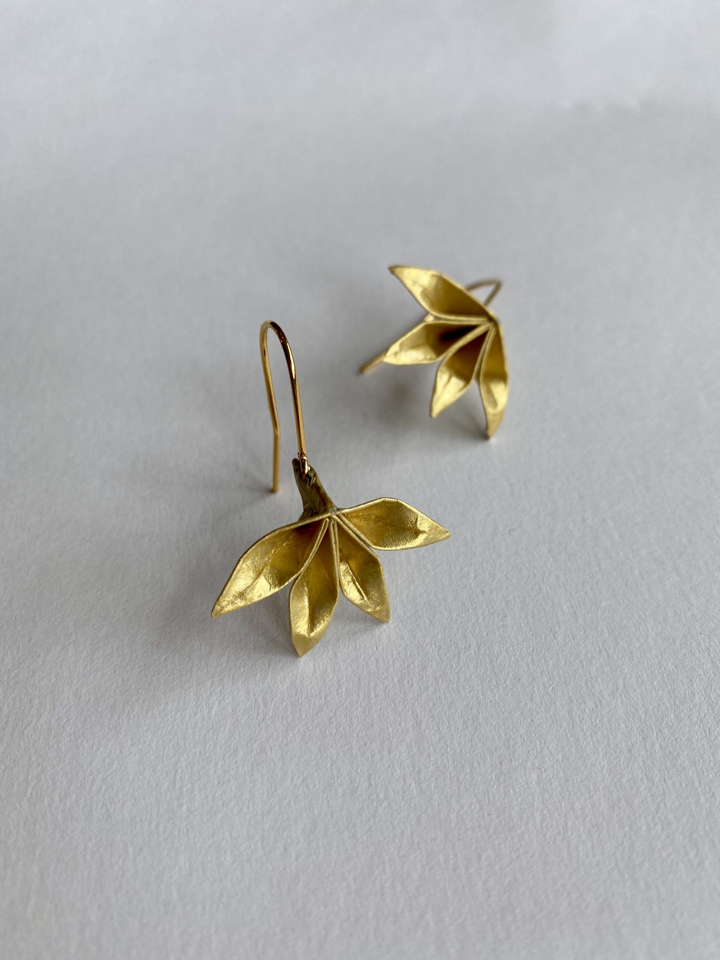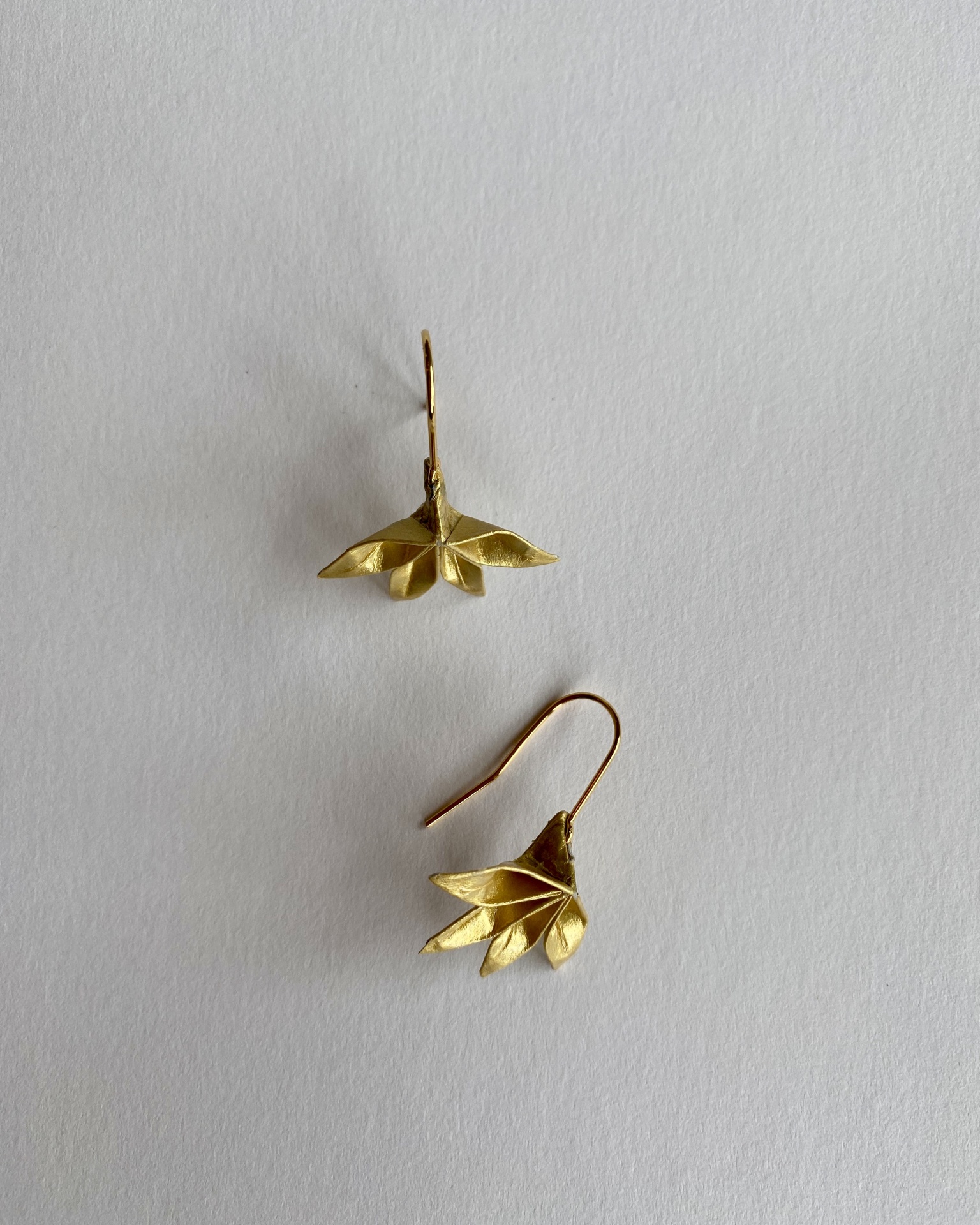 Brincos em gancho de prata banhada a ouro e flor em origami feita com papel dourado.