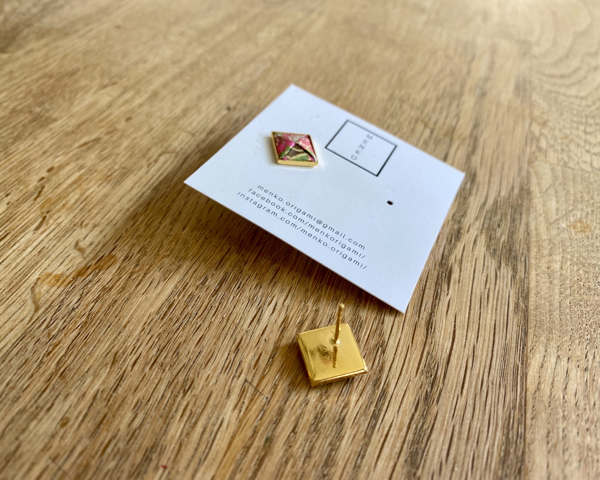 Brincos de espigão com peça em prata dourada e origami feito com papel japonês.