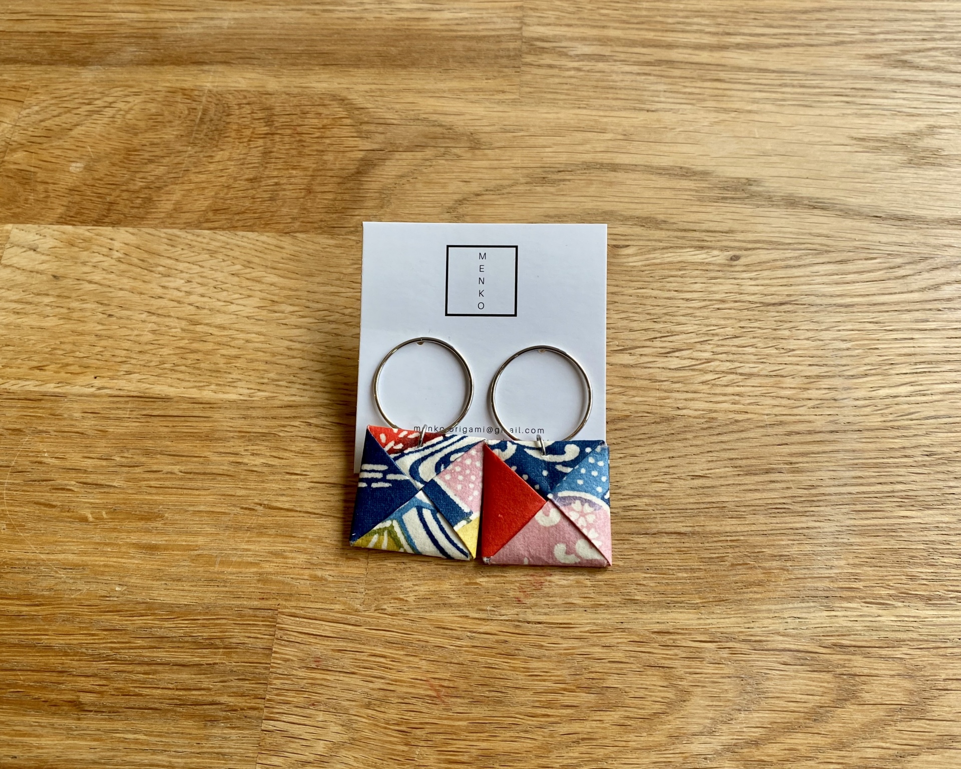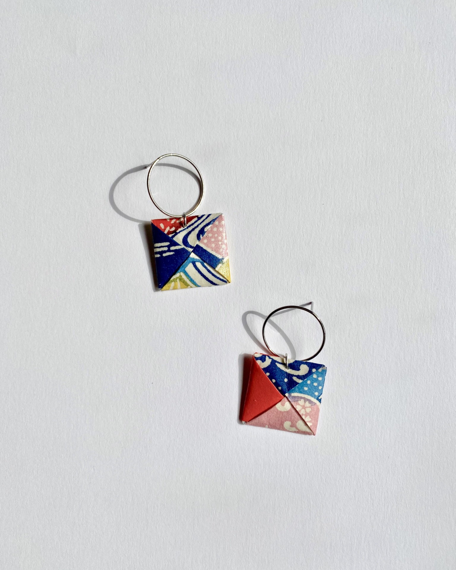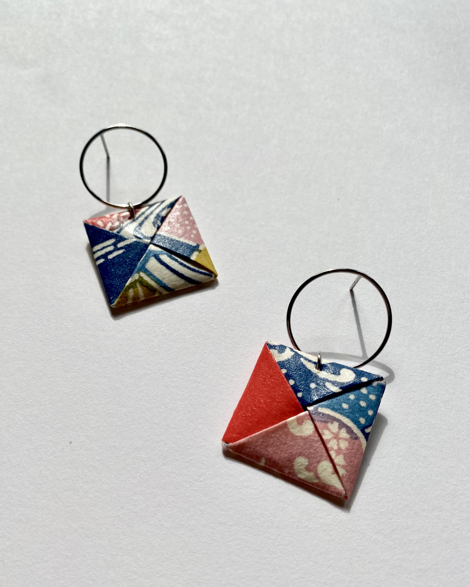 Brincos de espigão com argola em prata e peça em origami feita com papel japonês.