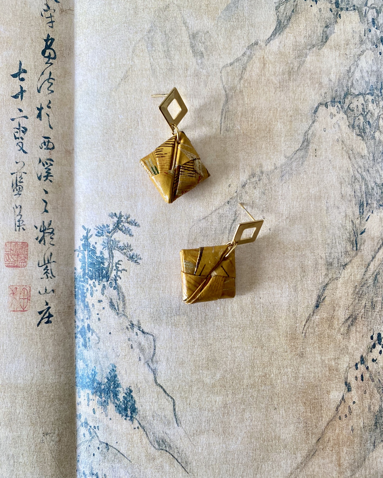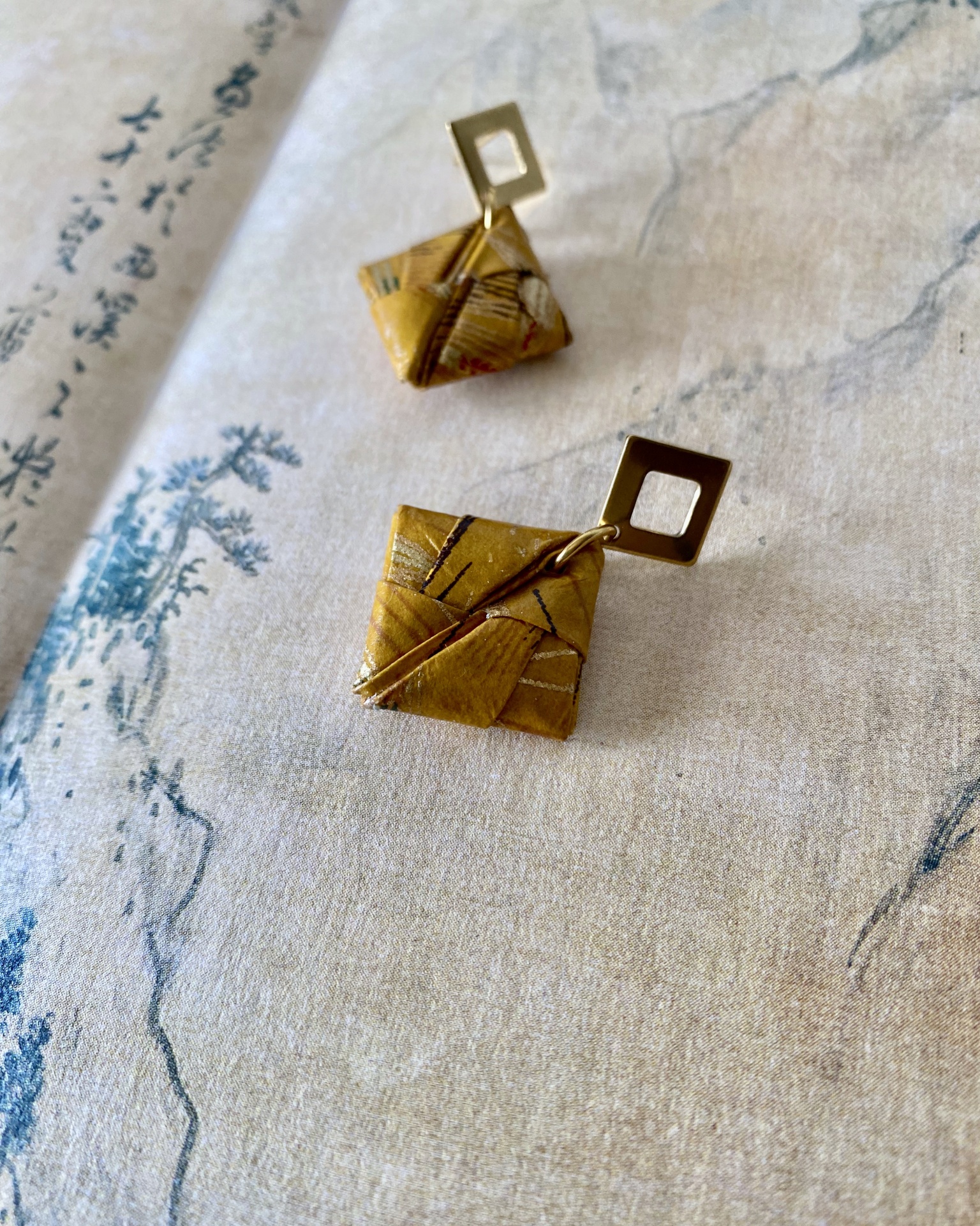 • Brincos com pendentes de tecido amarelo e argola dourada sobre pano com escrita e desenho asiático