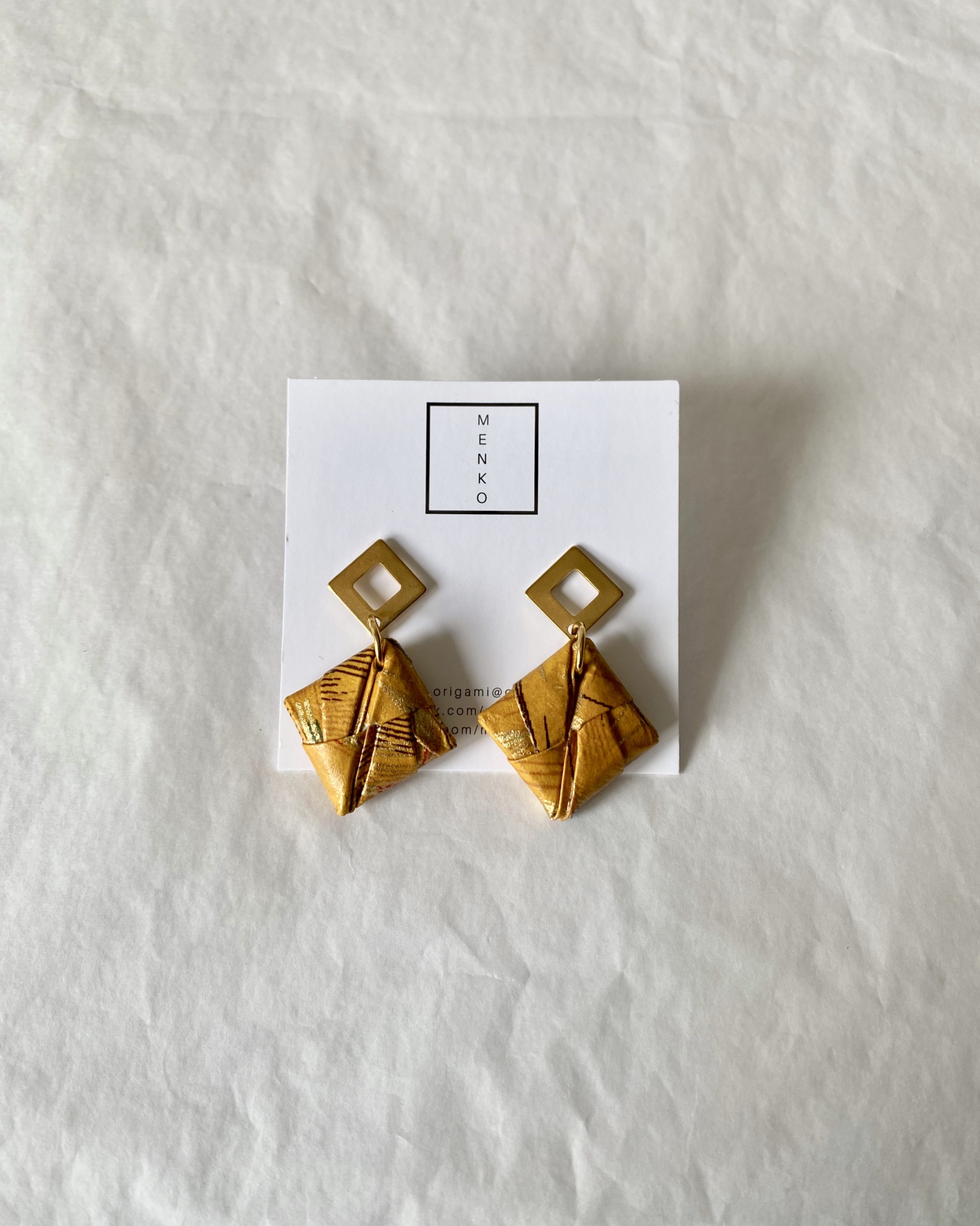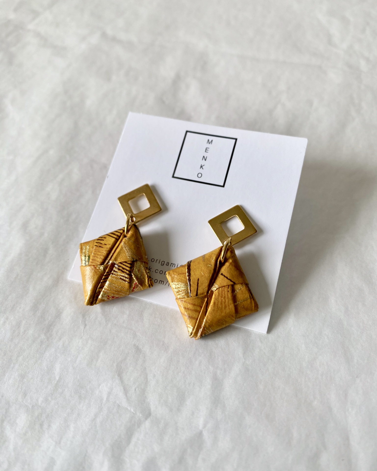 • Brincos de origami dourados com base quadrada metálica