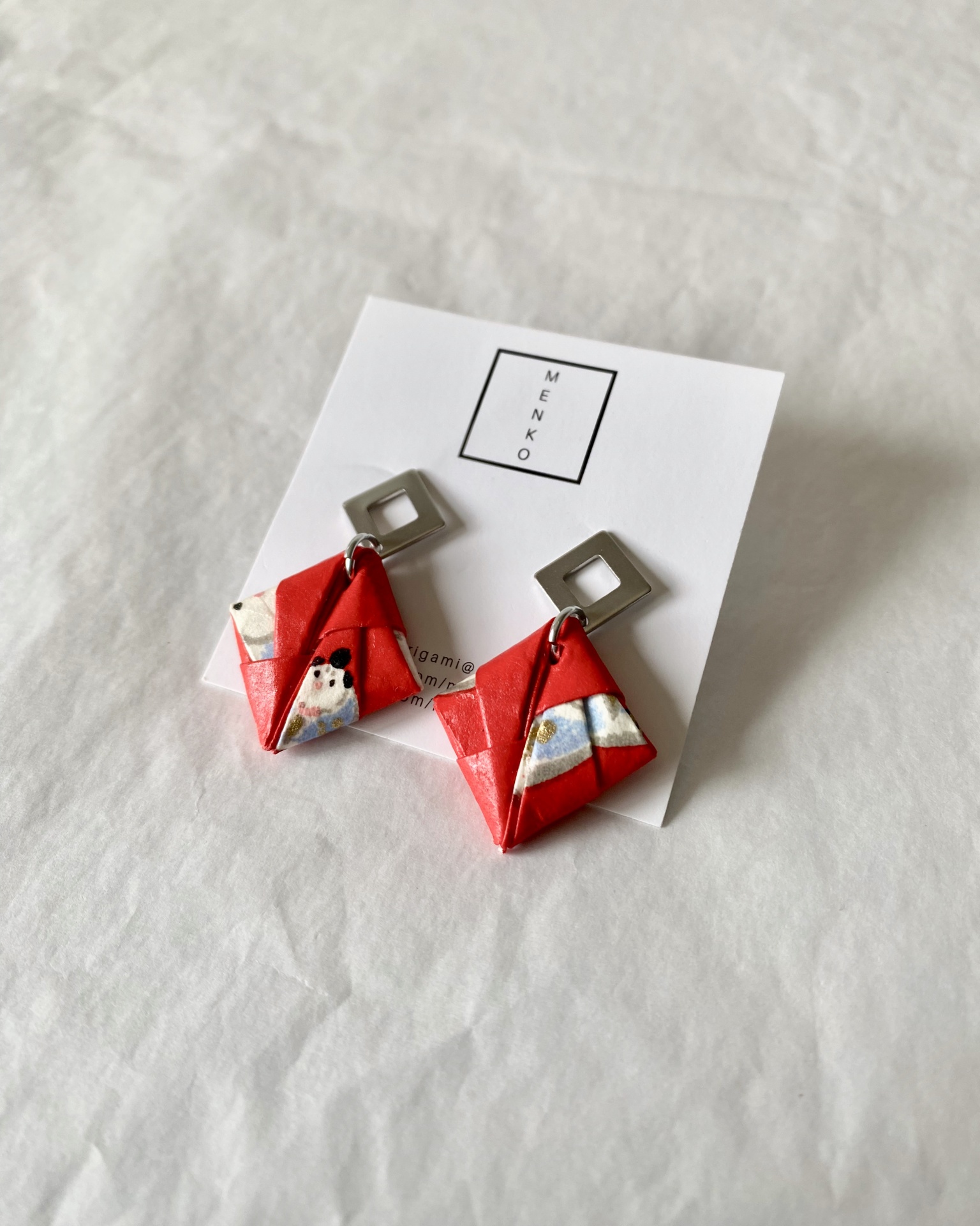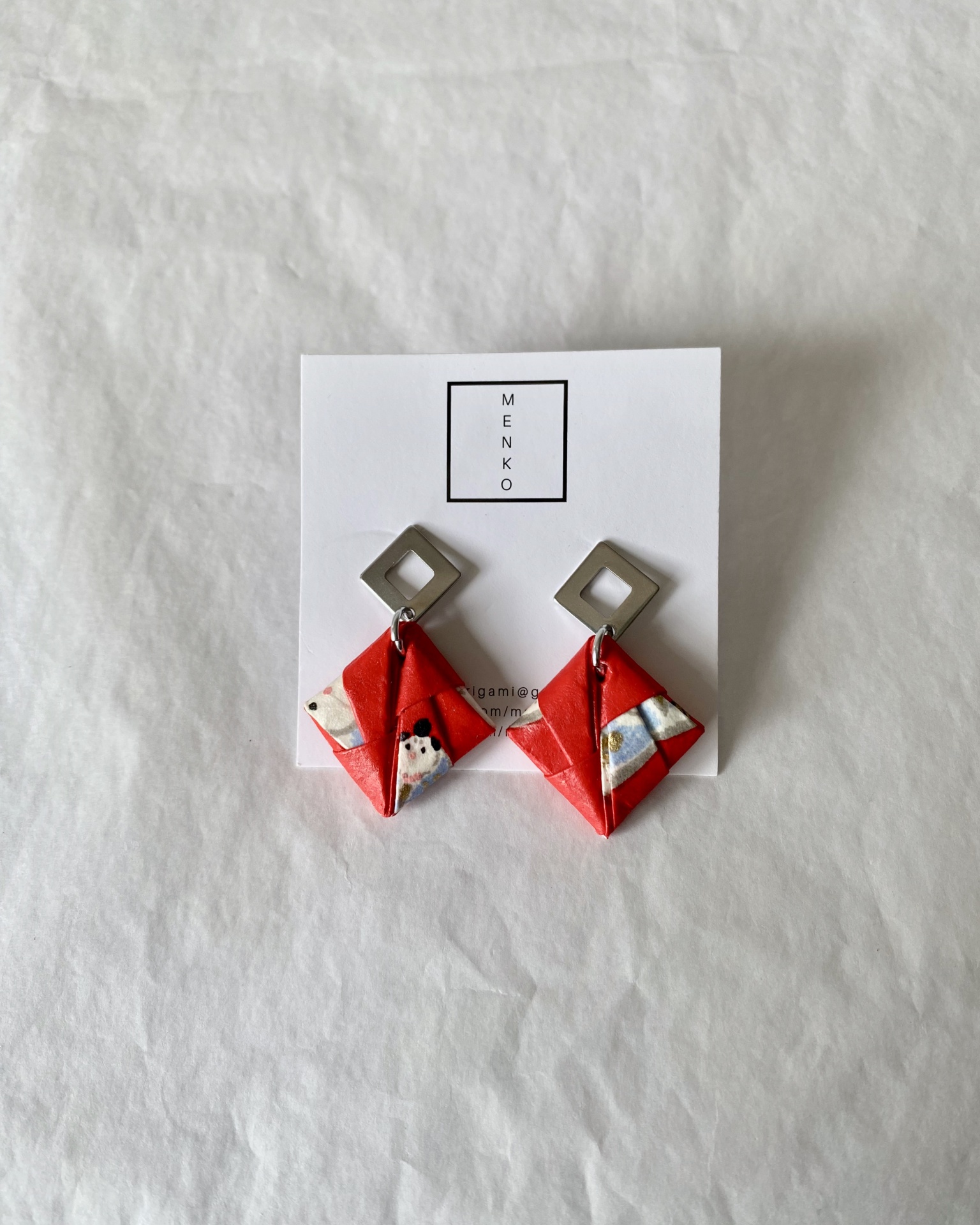 • Brincos quadrados prateados com pendente em origami vermelho com padrão, cartão branco MENKO