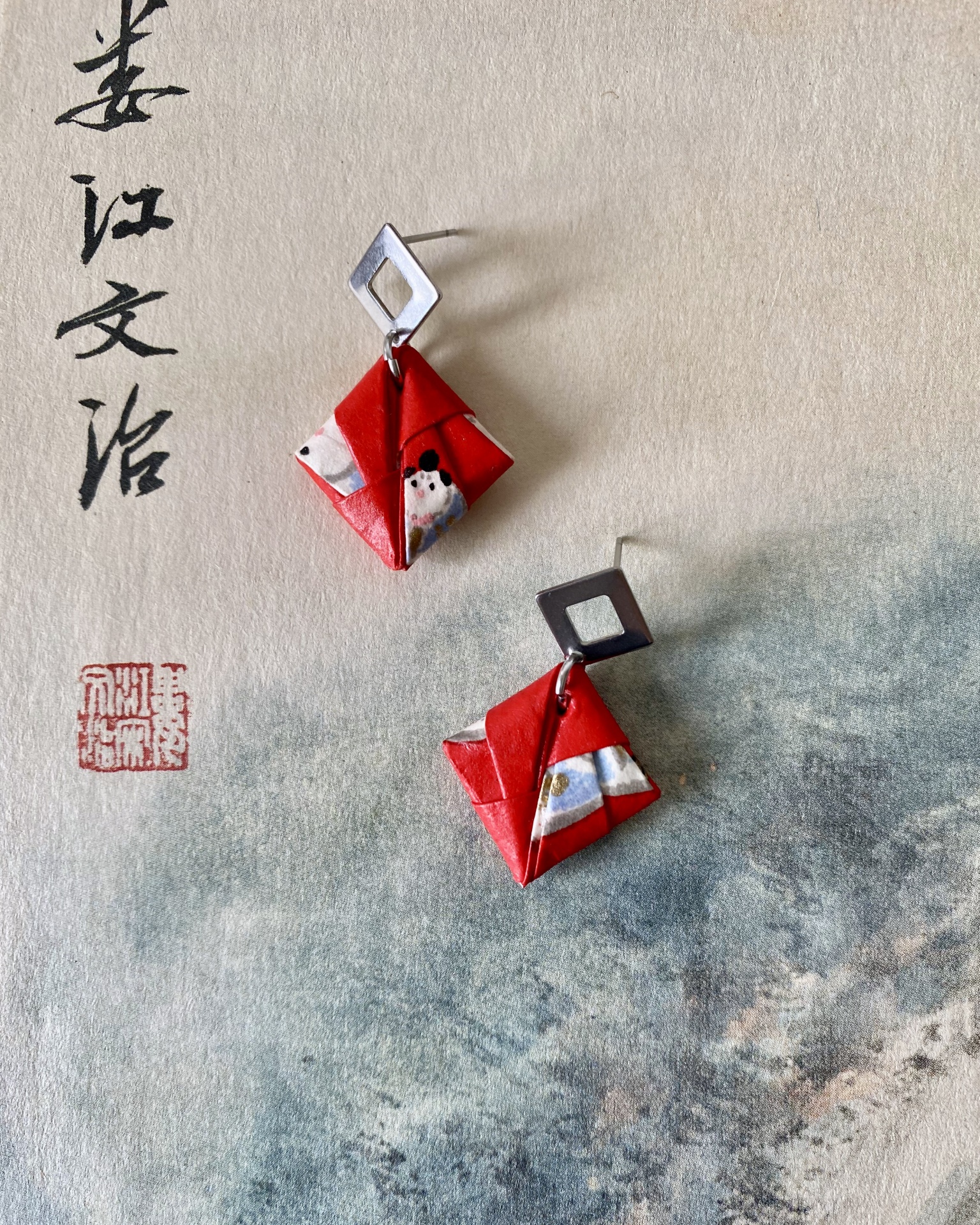• Brincos origami vermelhos com gancho quadrado prateado sobre fundo claro com carimbo oriental vermelho