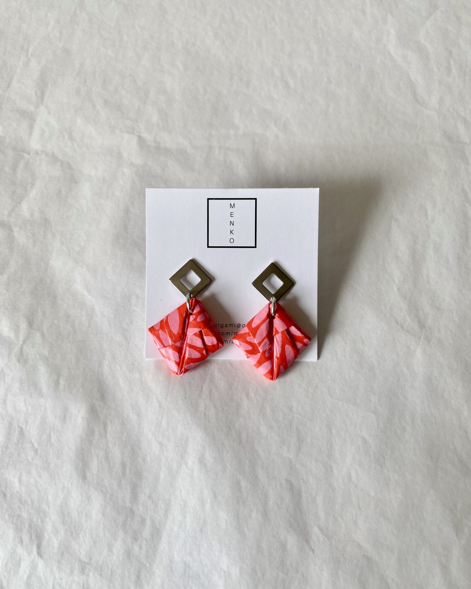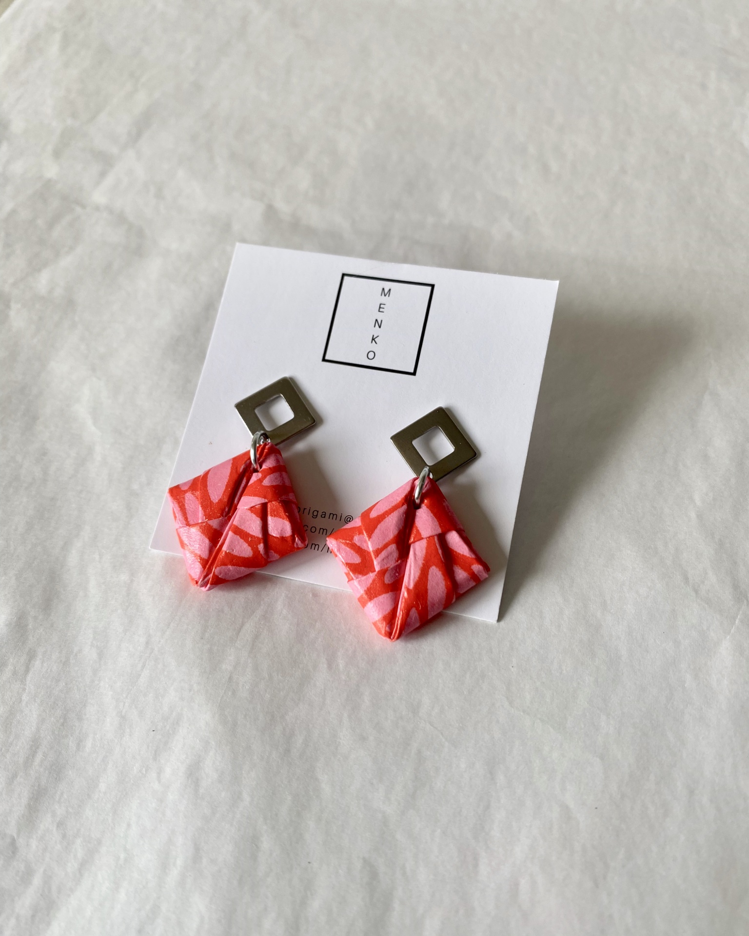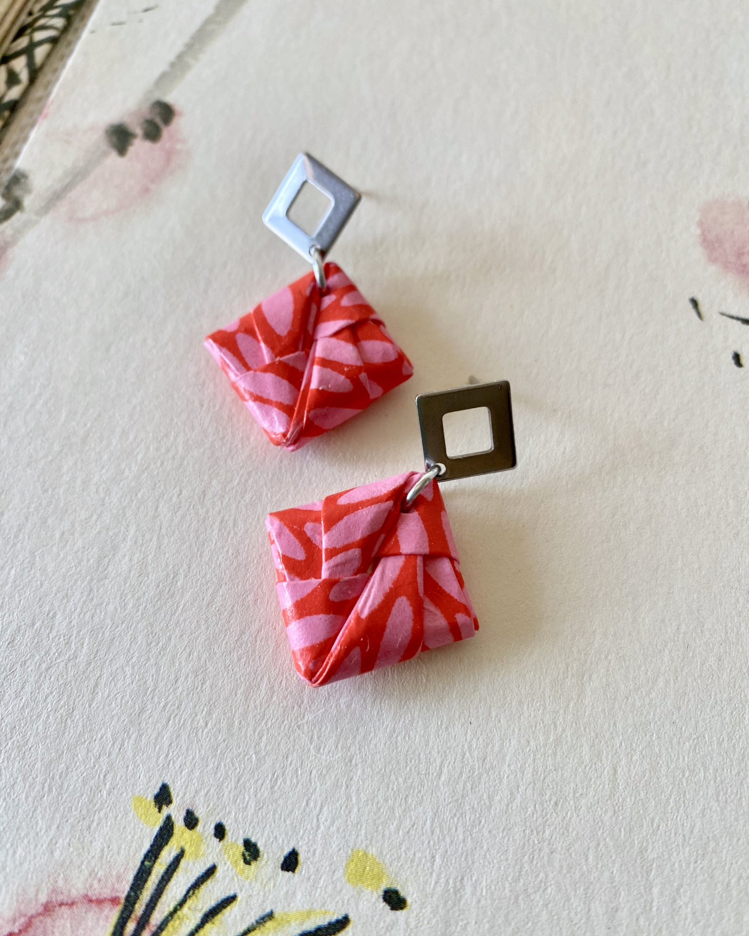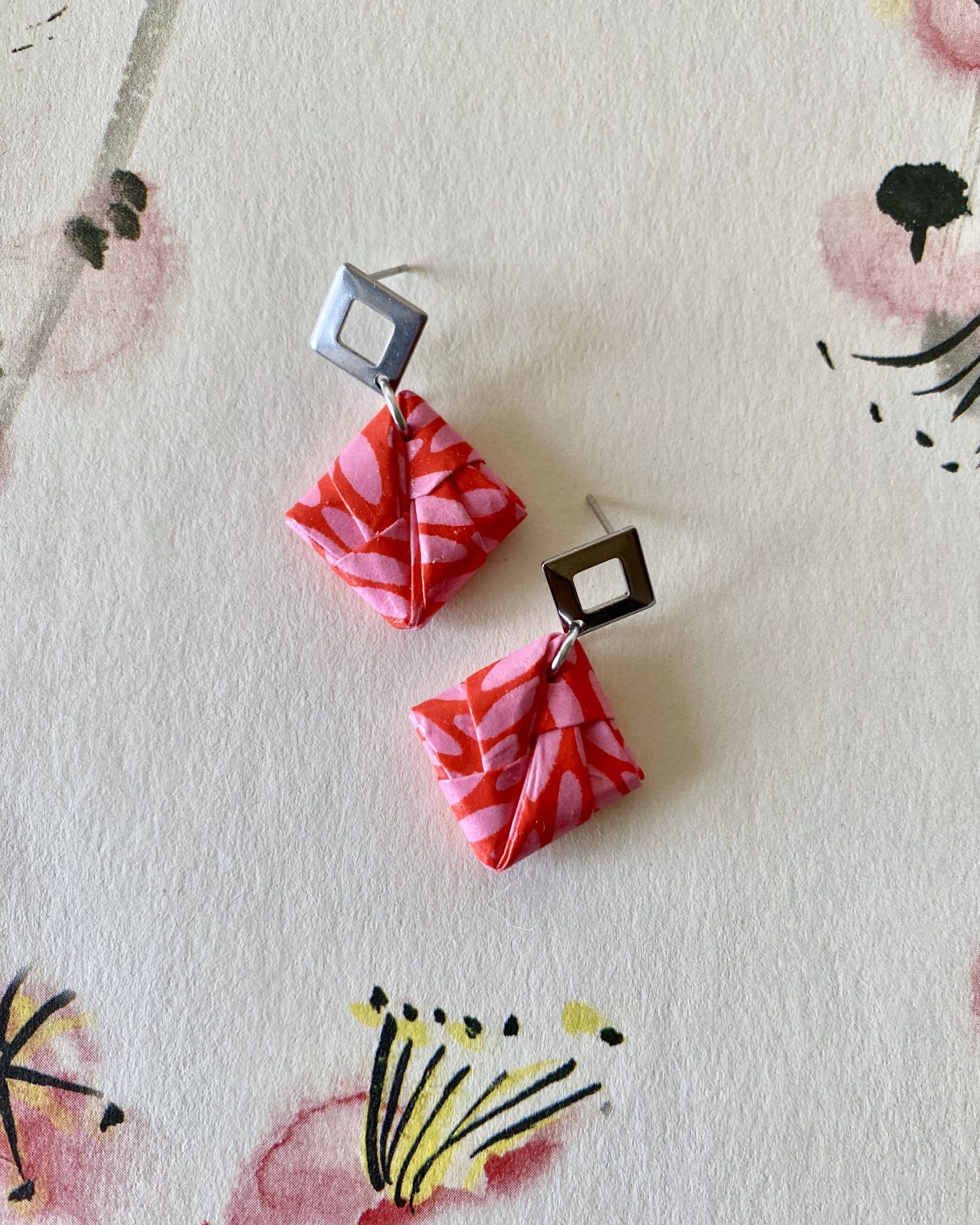 • Brincos quadrados de origami vermelho e rosa com pendente quadrado metálico prateado em fundo com pintura floral