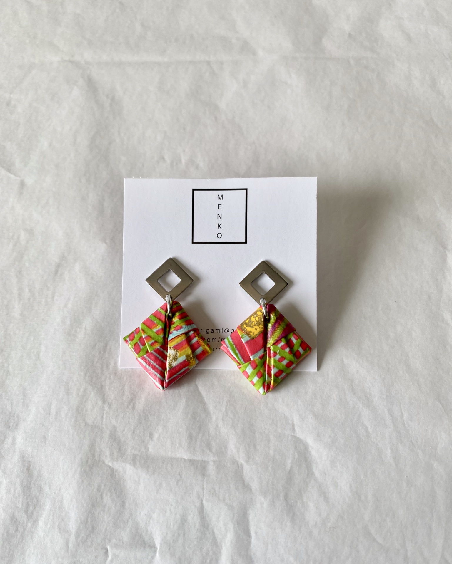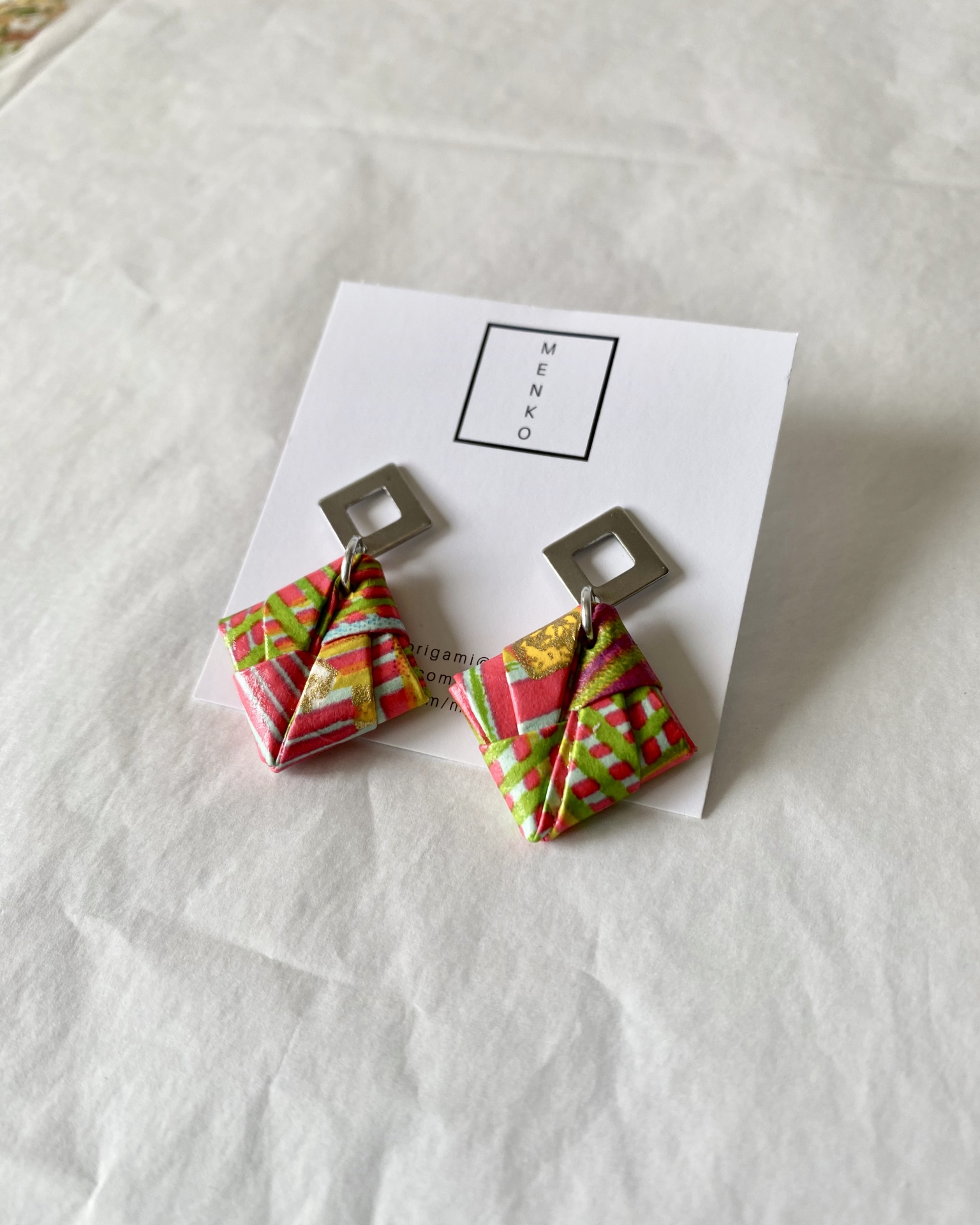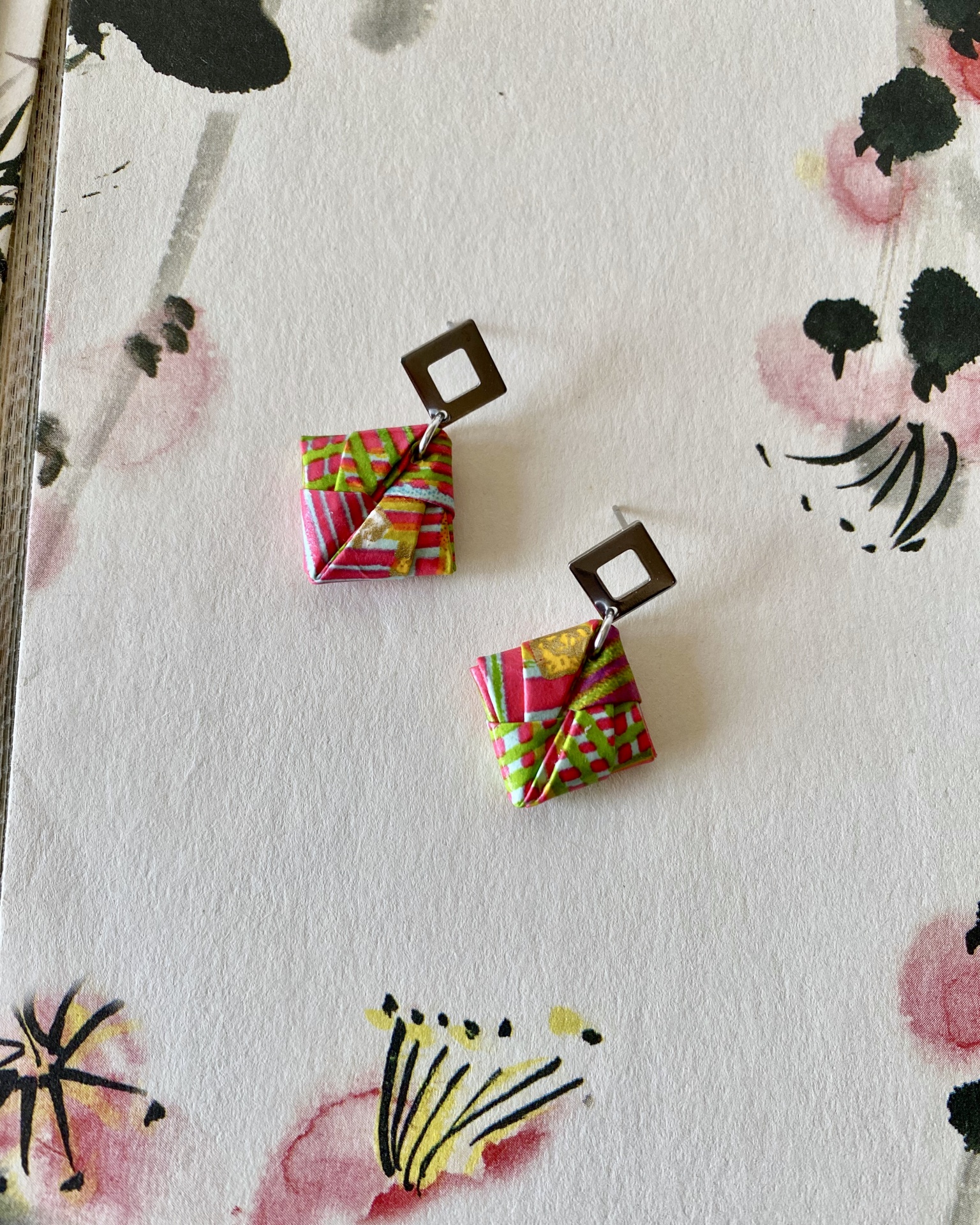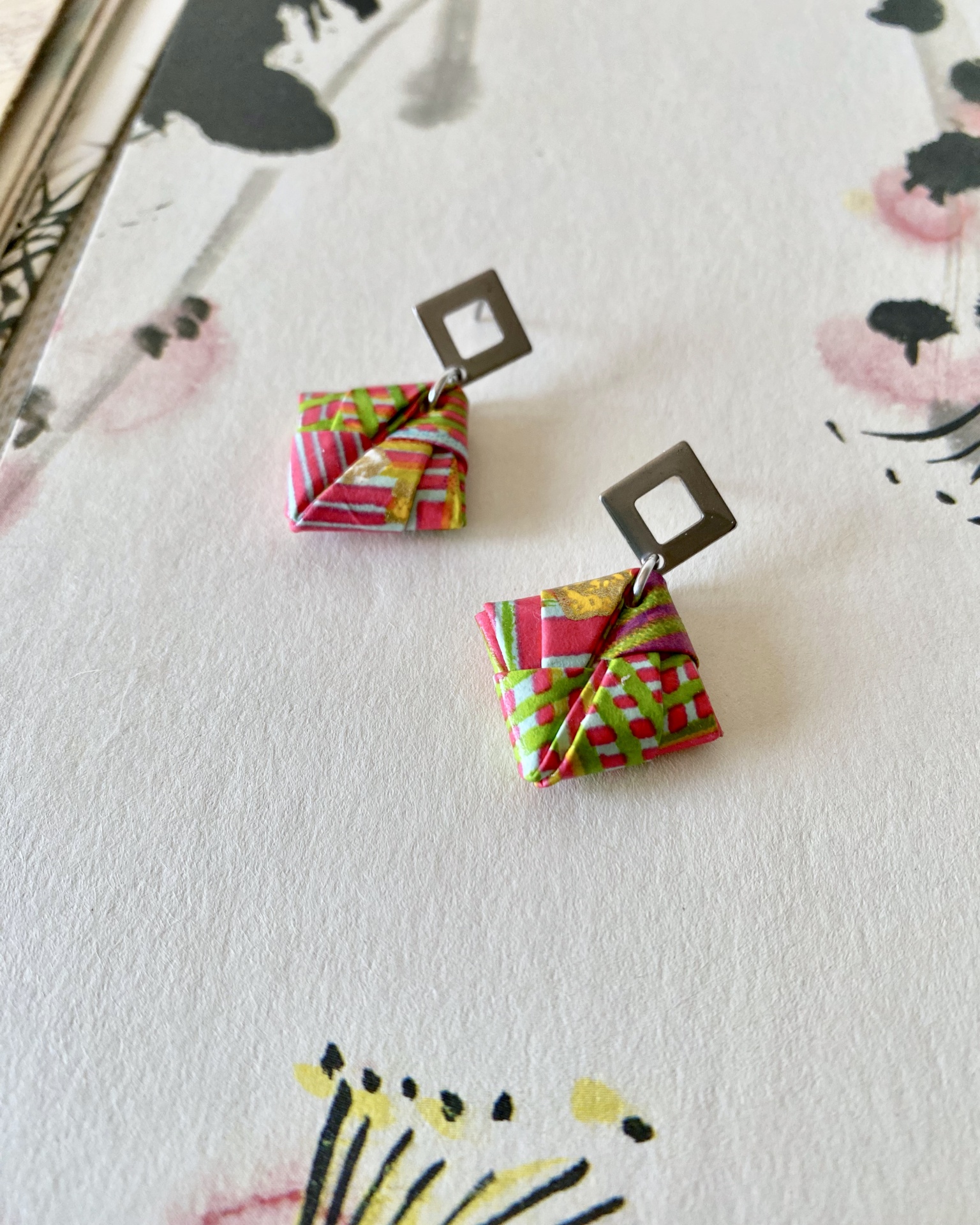 Brincos de espigão com peça em forma de quadrado vasado em aço prateado e peça geométrica em origami feita com papel japonês.