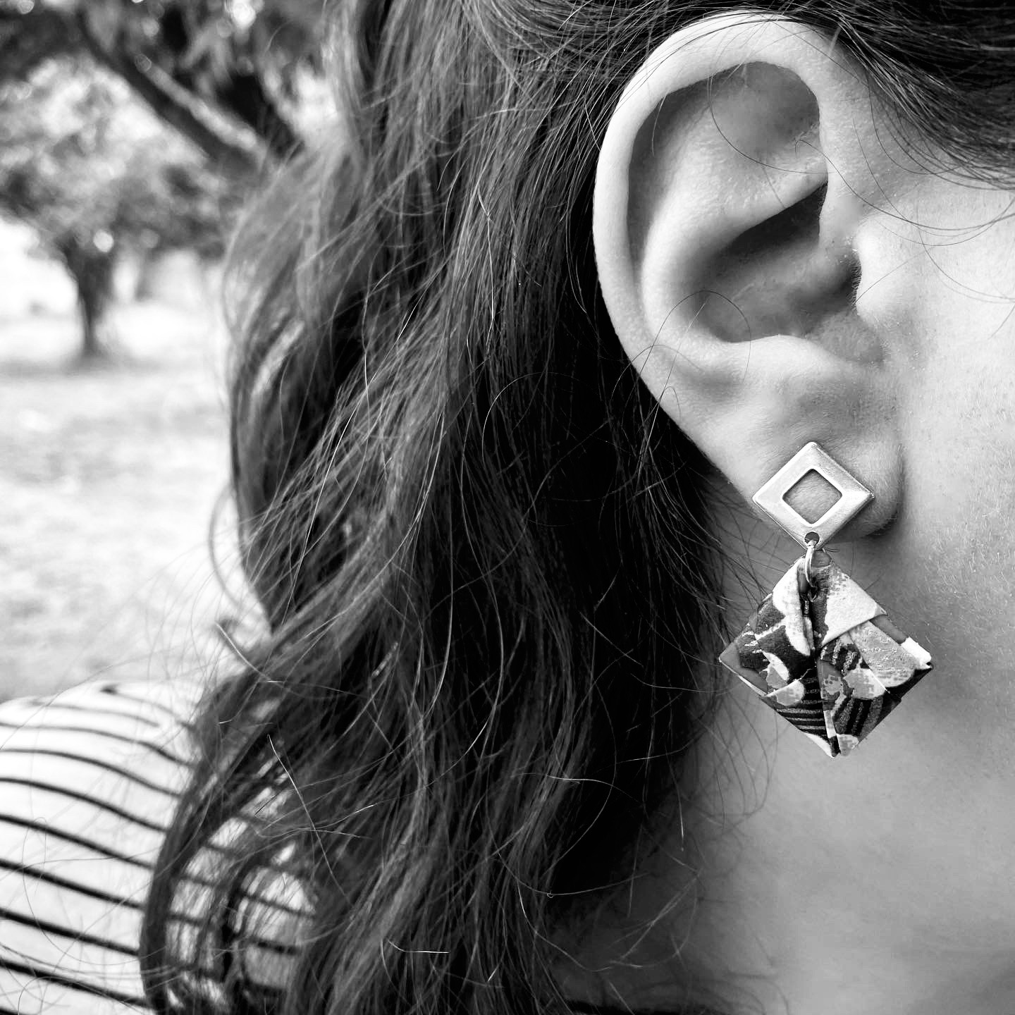 Brincos de espigão com peça em forma de quadrado vasado em aço prateado e peça geométrica em origami feita com papel japonês.