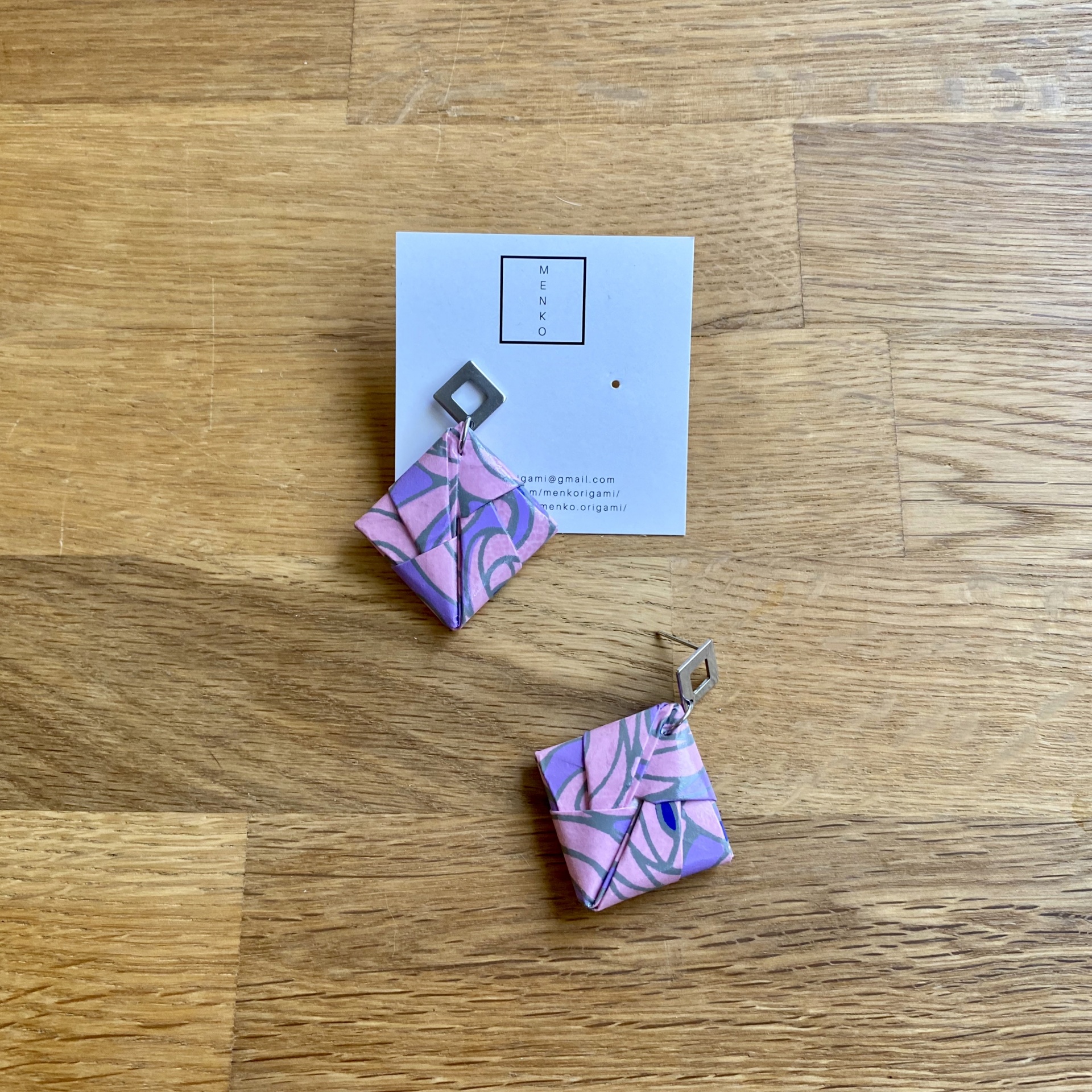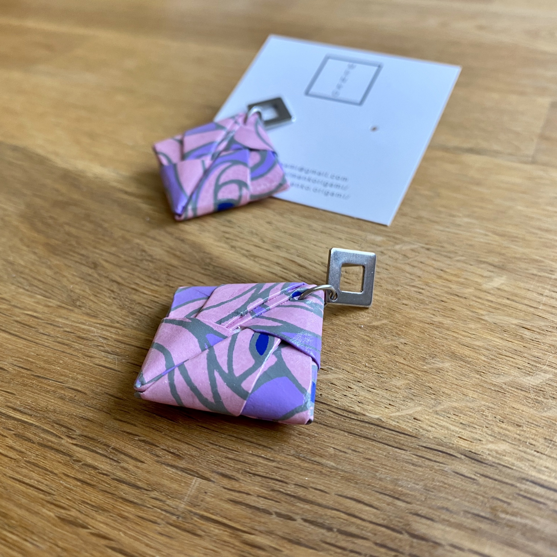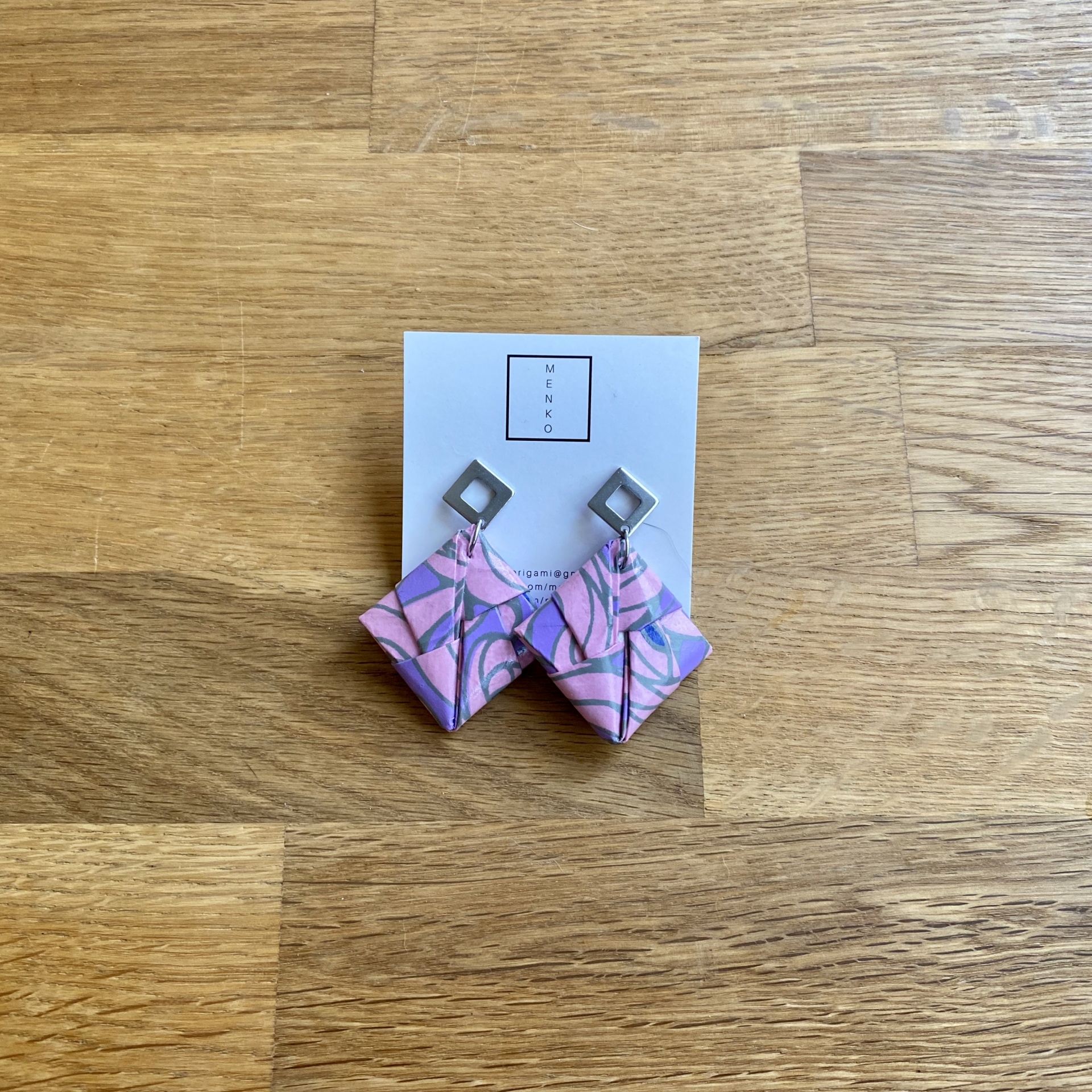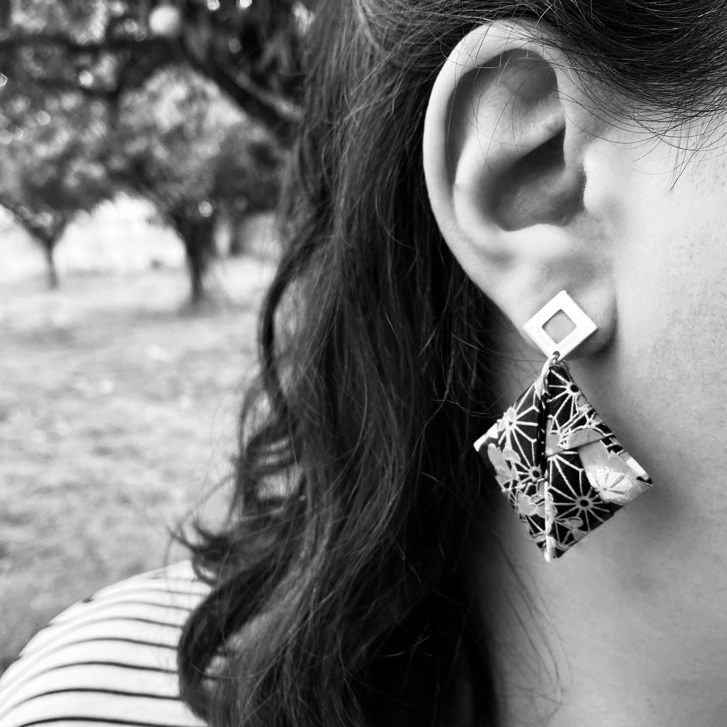 Brincos de espigão com peça em forma de losango vasado em aço prateado e peça geométrica em origami feita com papel japonês.
