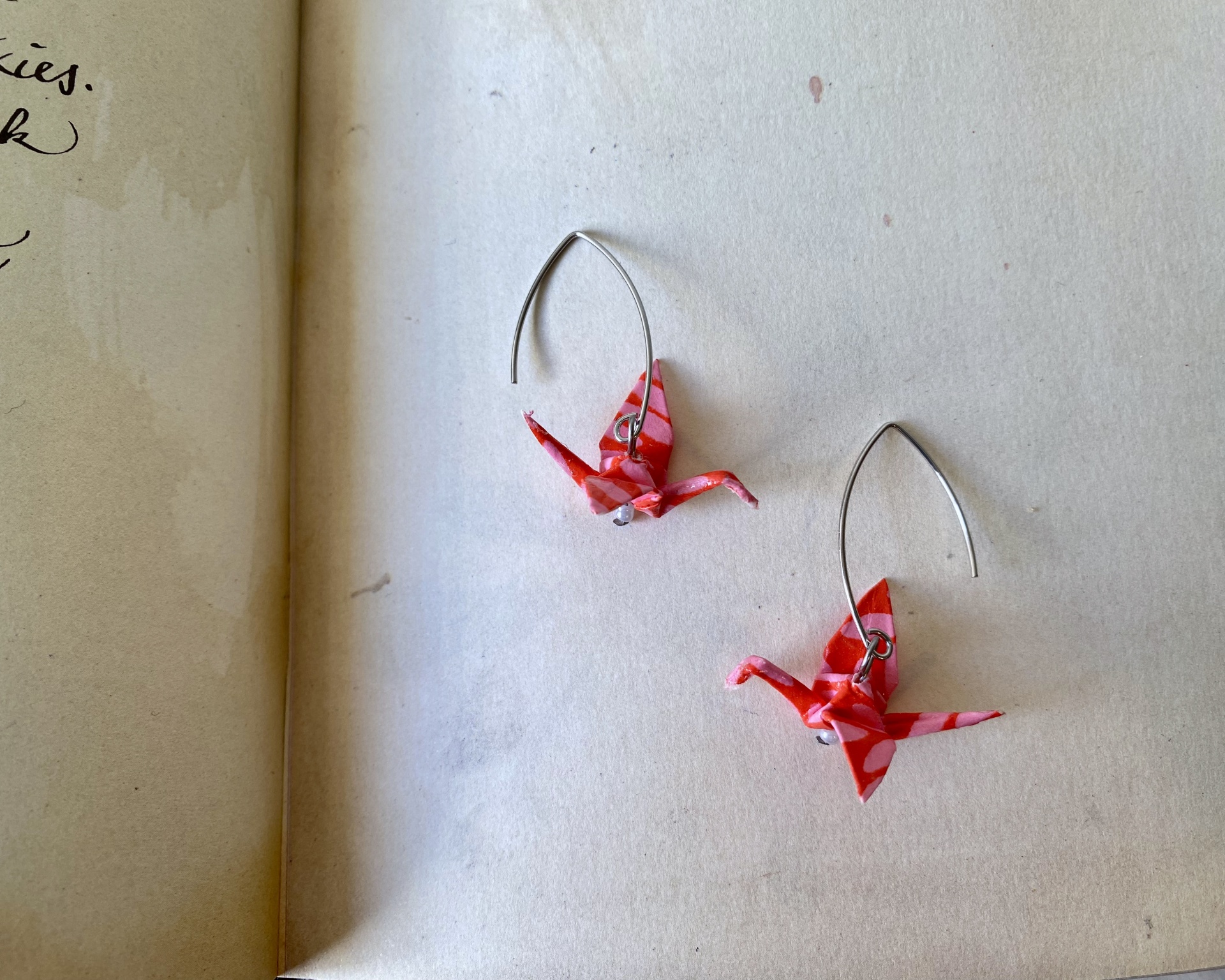 • Brincos com pássaros de origami vermelho e rosa em argolas de metal prateado.