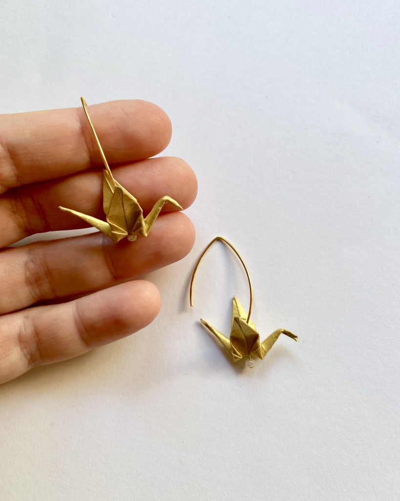 Brincos com gancho em prata dourada e tsuru em origami feito com papel dourado.