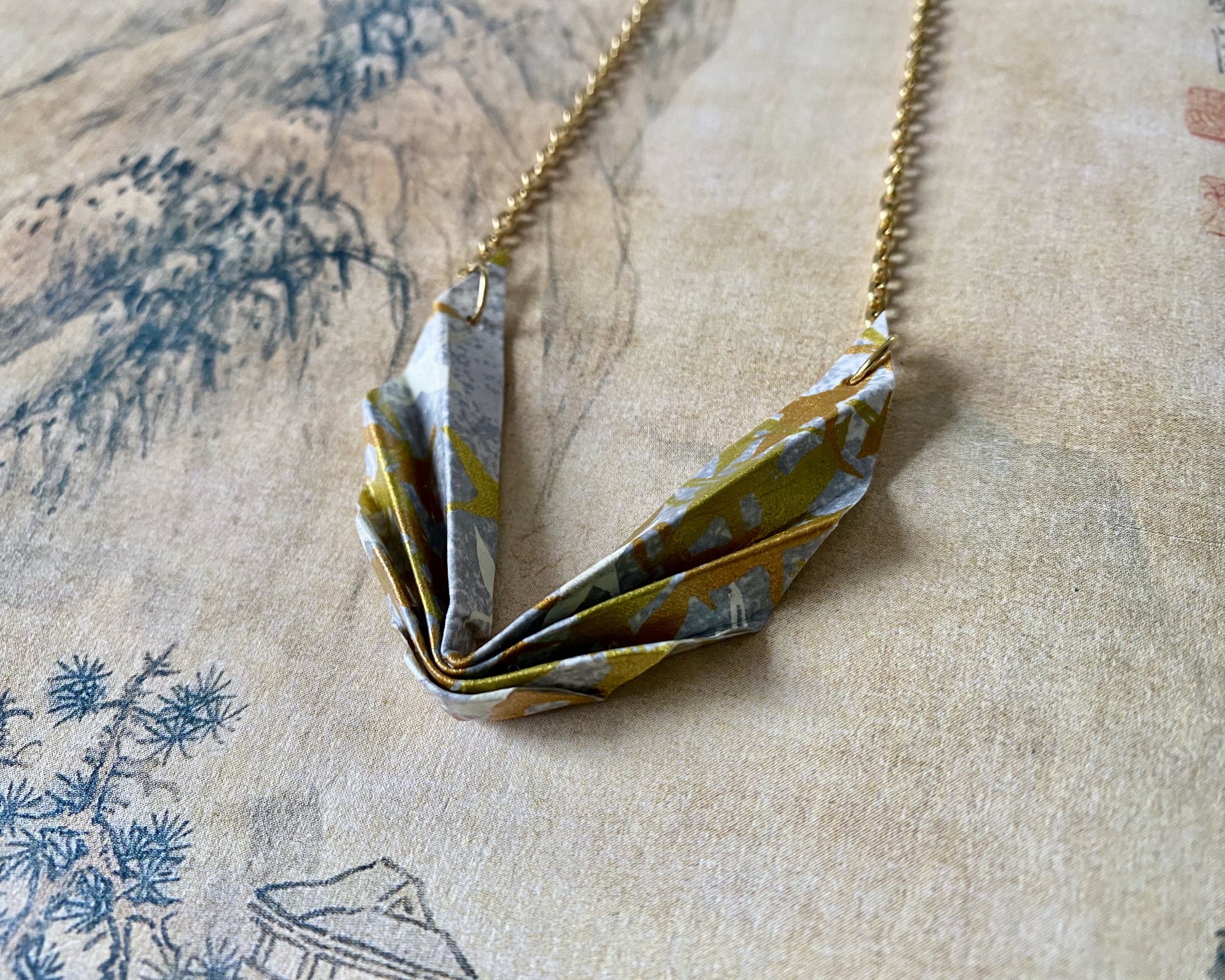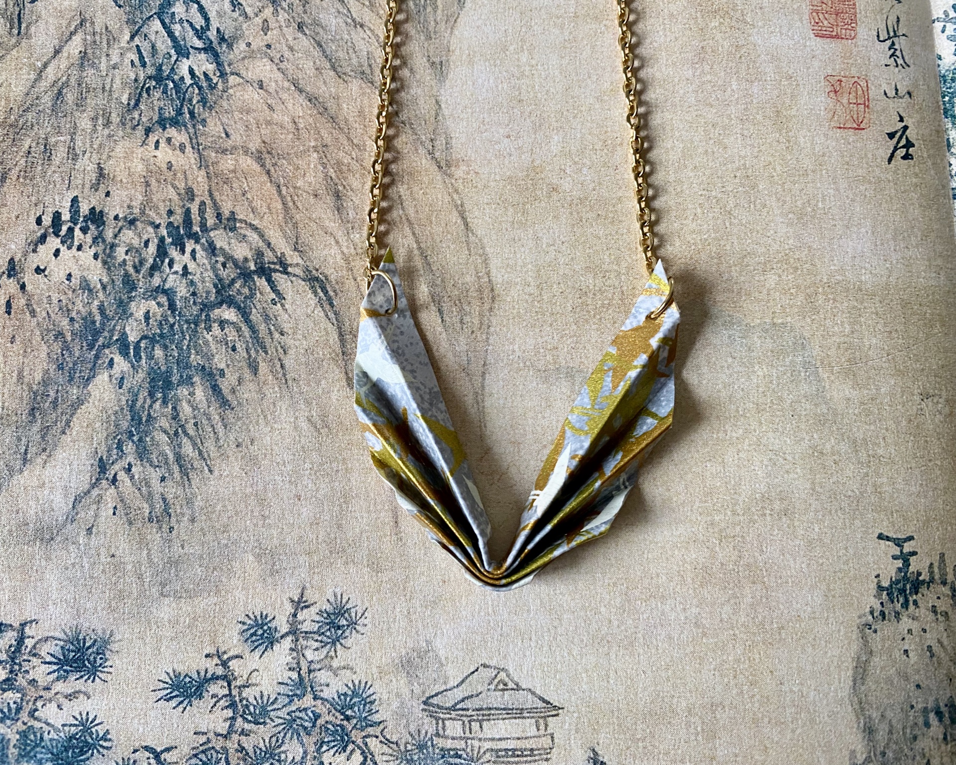 Colar em aço com peça em origami feita com papel japonês.