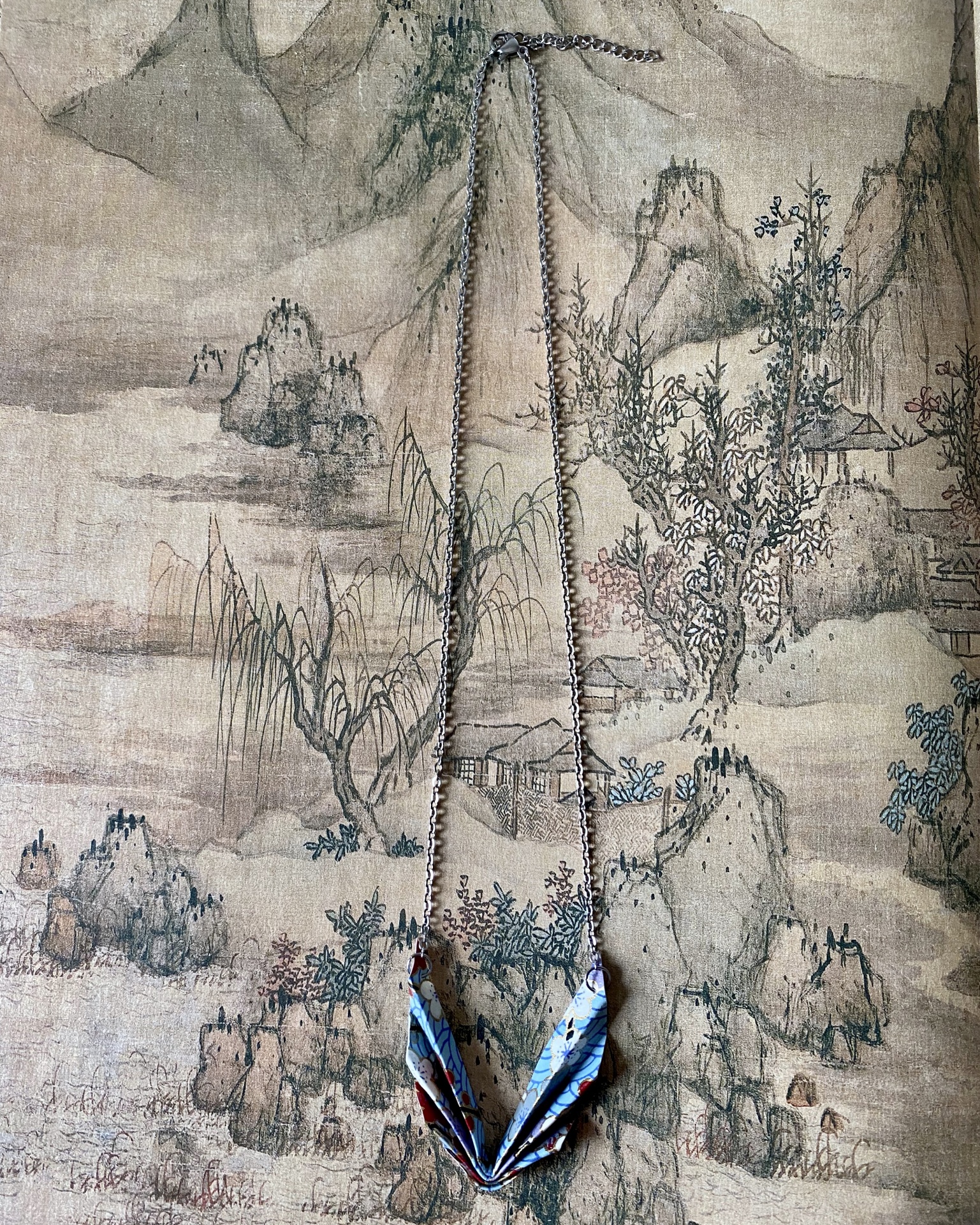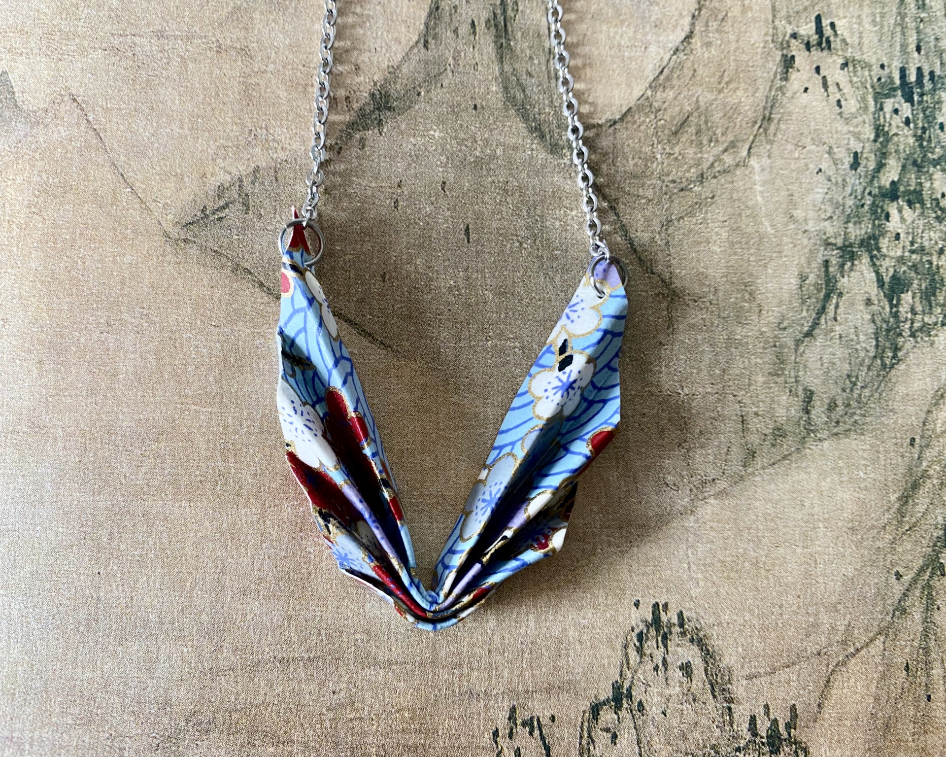 Colar em aço com peça em origami feita com papel japonês.