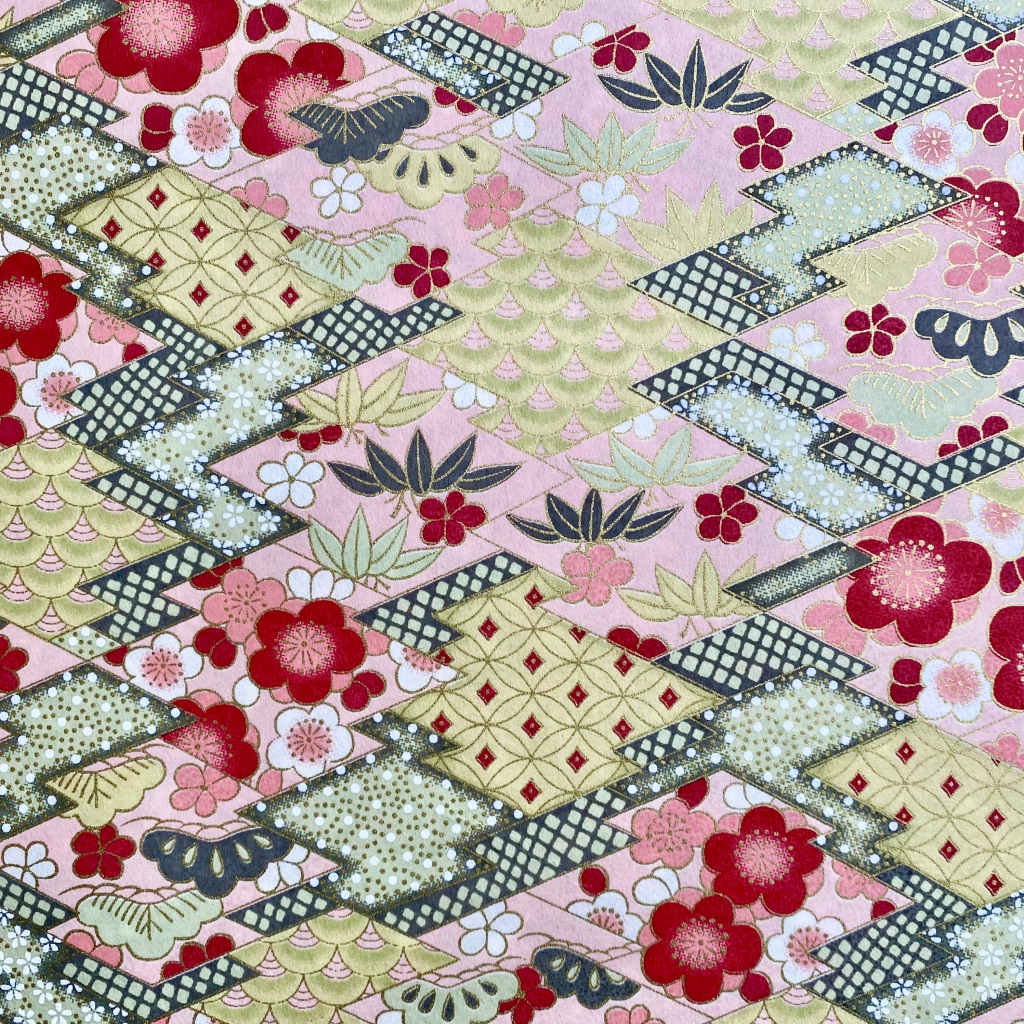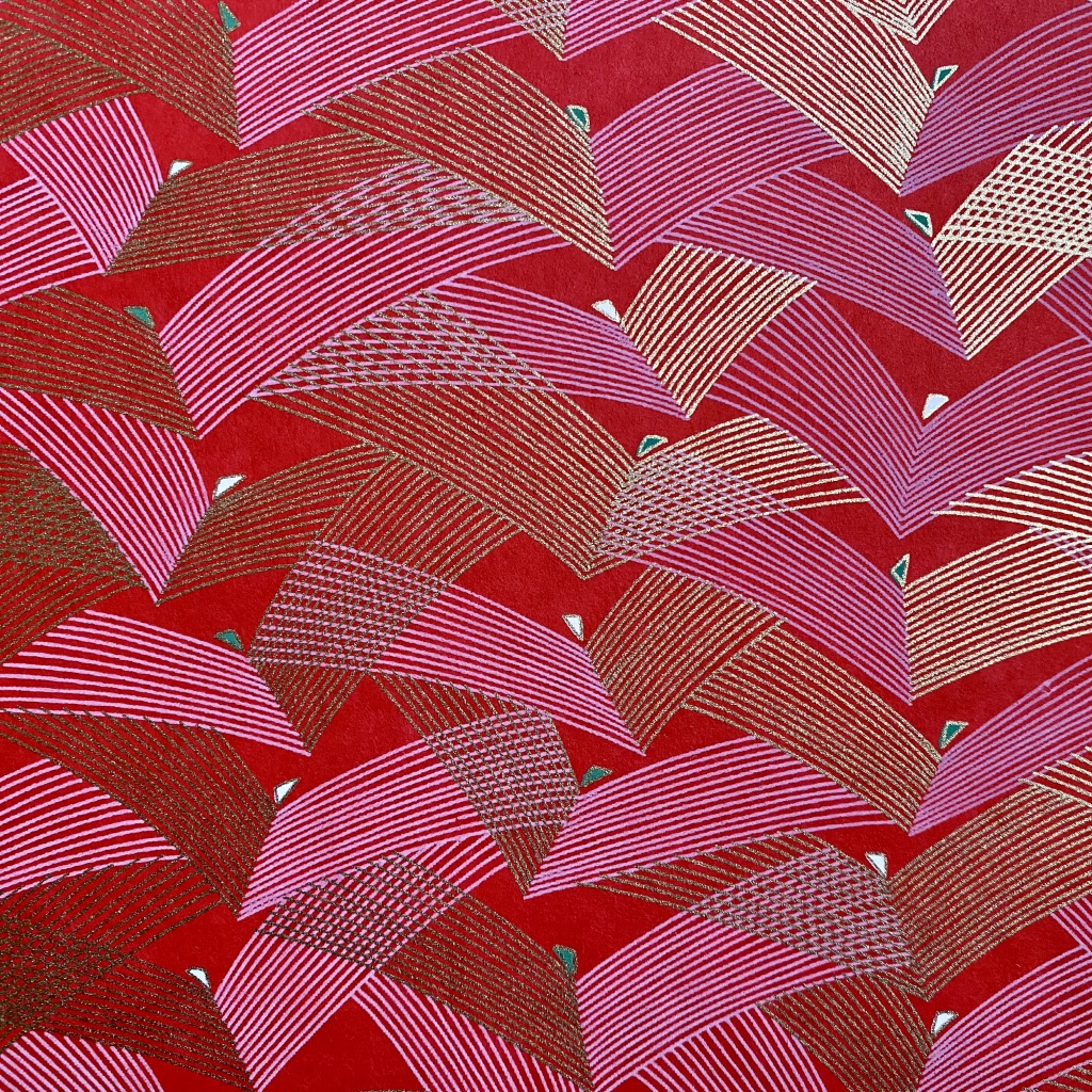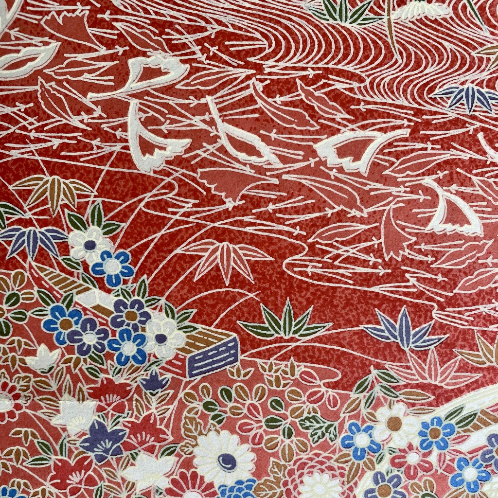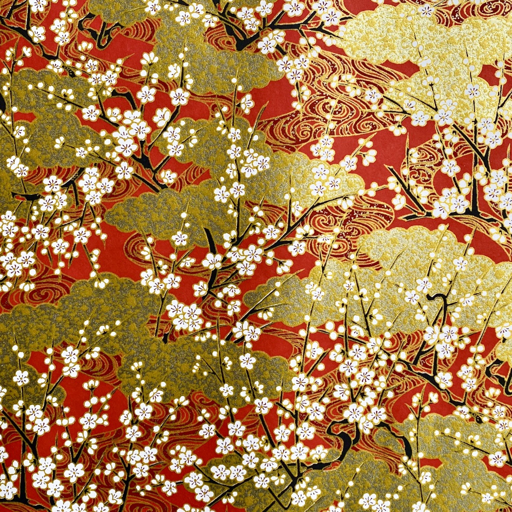 • Pano vermelho com padrão floral japonês em dourado, branco e preto.