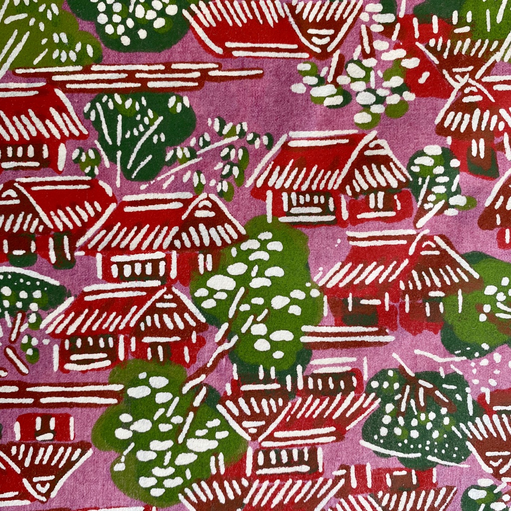 • Tecido estampado com casas vermelhas e verdes e árvores em fundo cor de rosa
