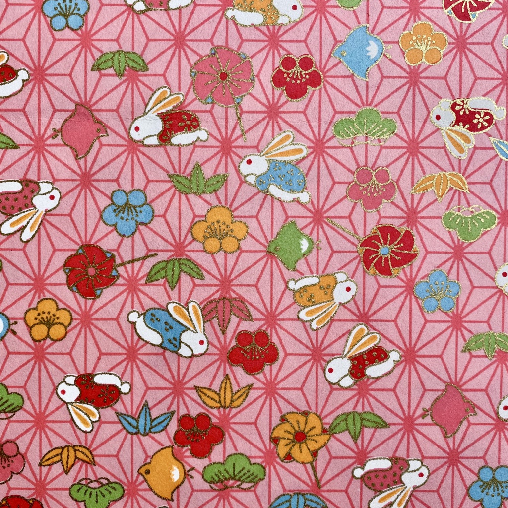 • Tecido rosa com coelhos brancos e flores coloridas