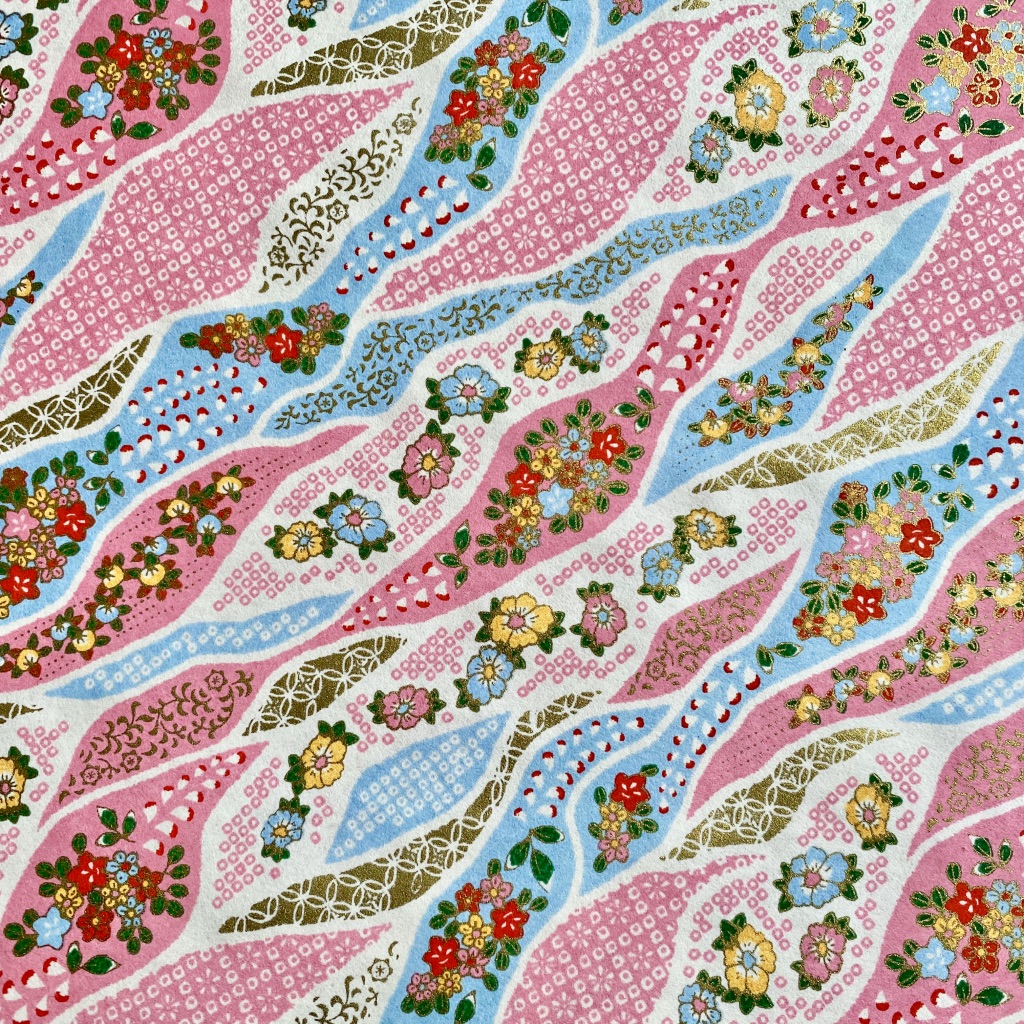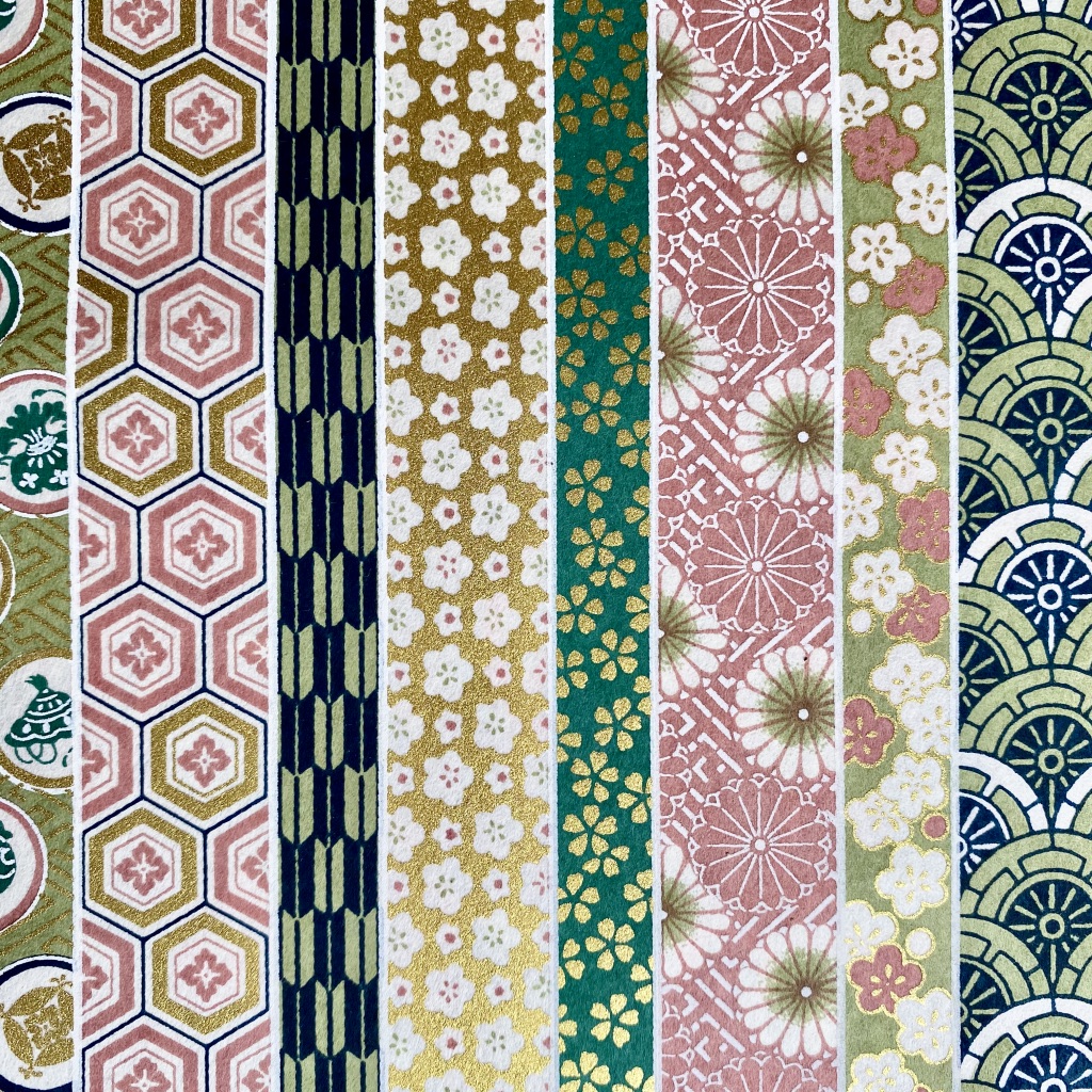 • Nove padrões de tecido asiático coloridos com motivos florais e geométricos