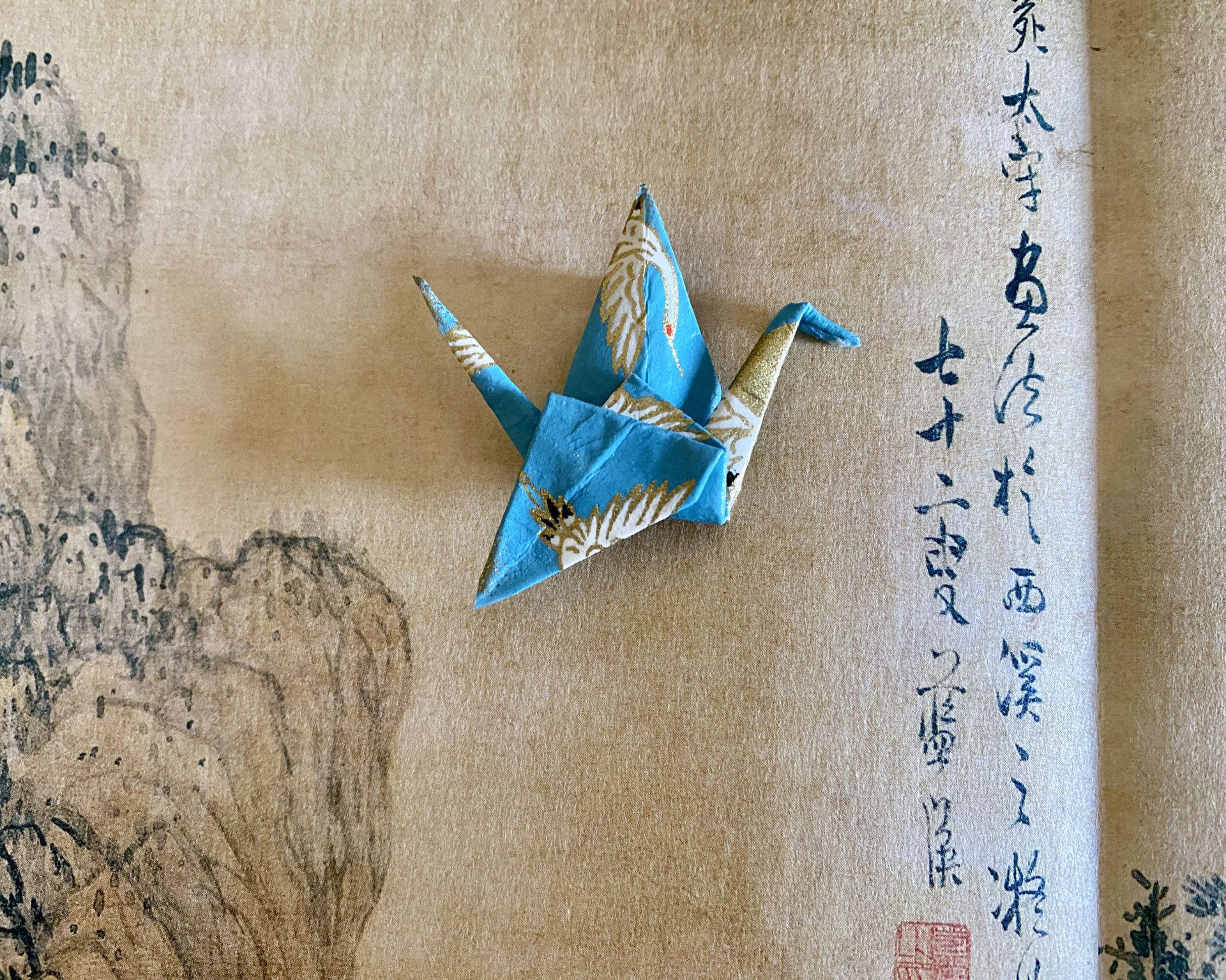 Gralha de origami azul com padrão de gruas douradas sobre papel com caracteres asiáticos