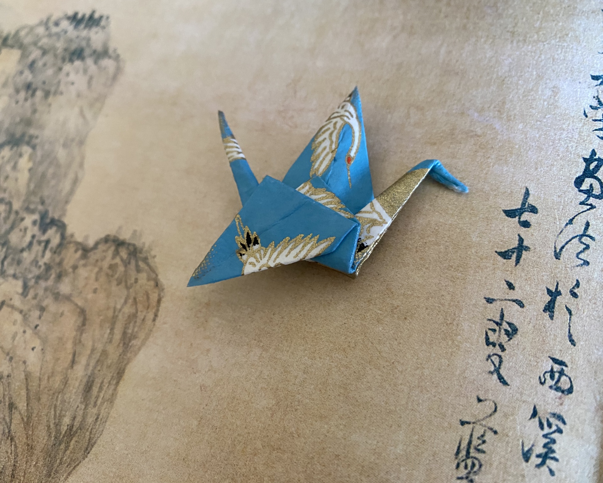 • Origami de garça azul e dourada sobre fundo bege com texto asiático