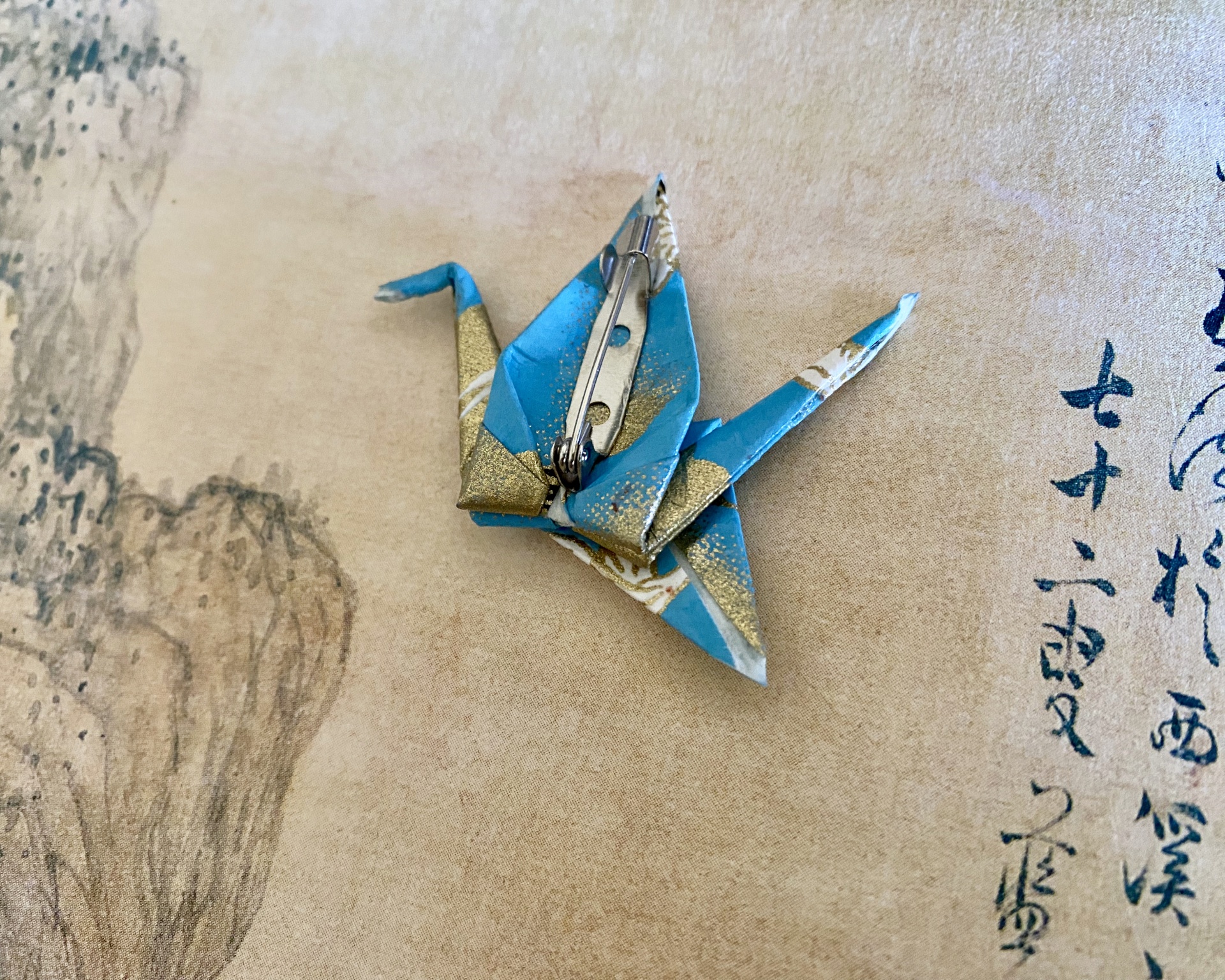 • Broche origami em papel azul e dourado com fecho metálico sobre fundo bege com caligrafia asiática
