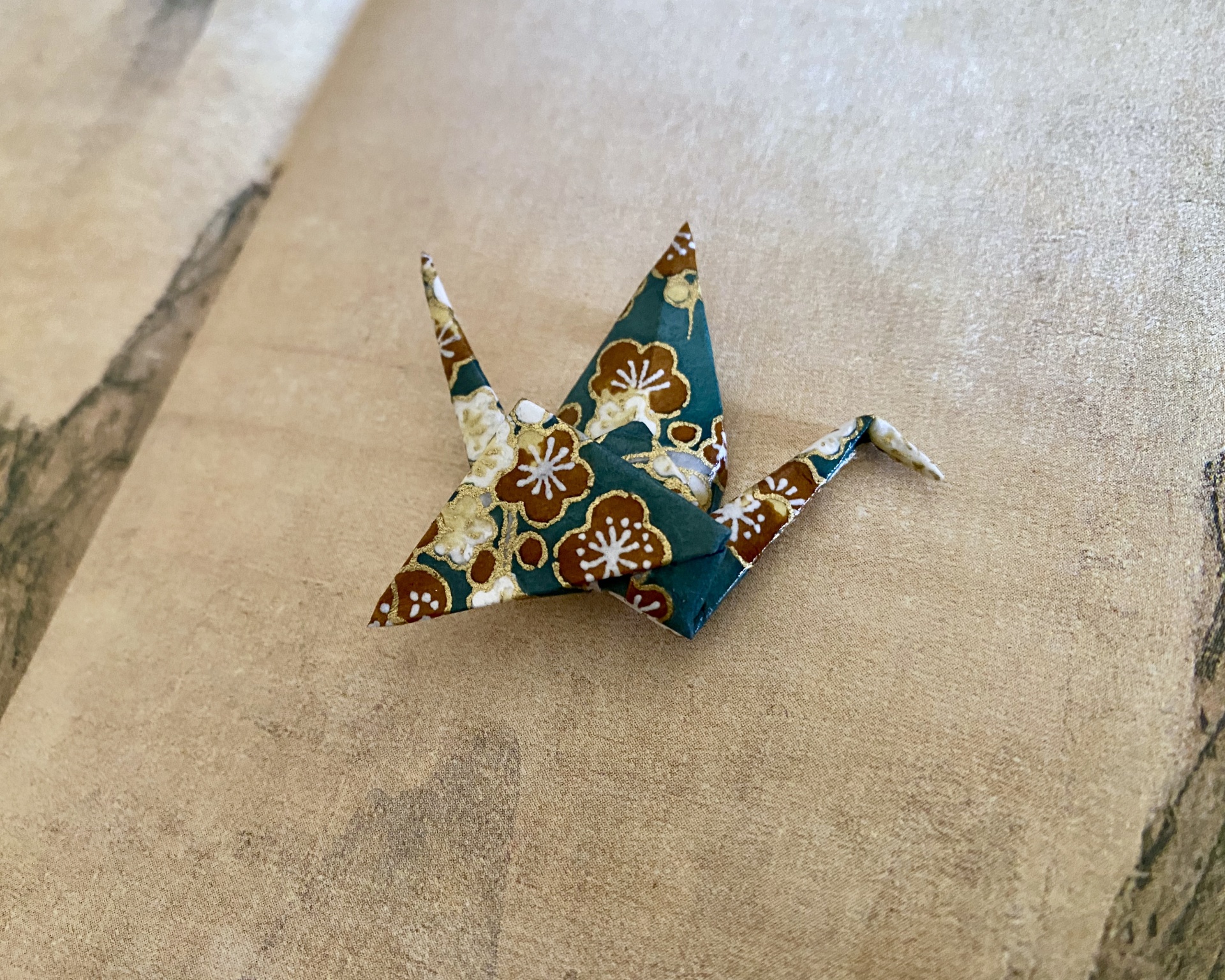 • Origami de garça em papel decorado floral castanho e branco sobre fundo verde.