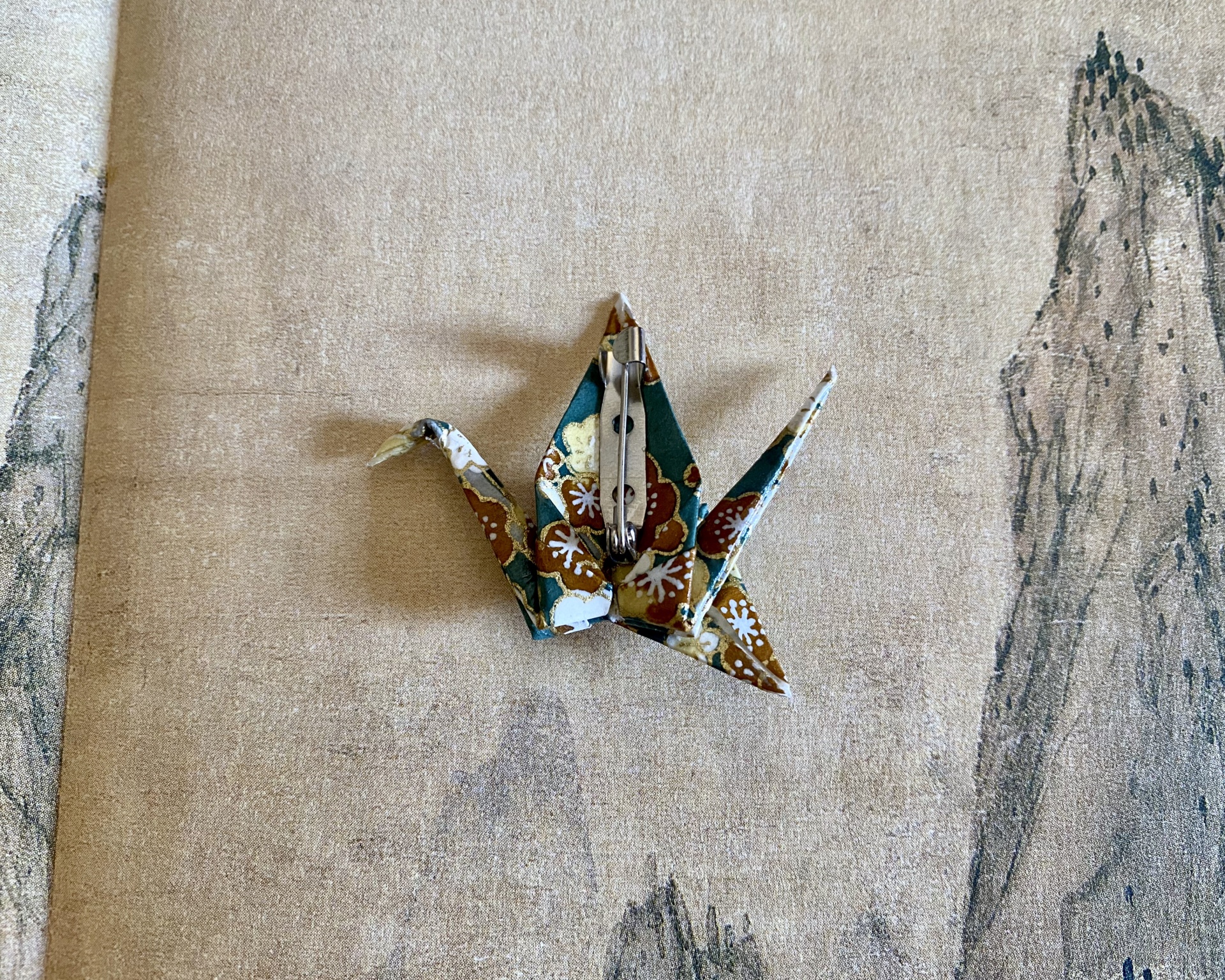 • Broche em tecido com padrão floral verde e castanho em forma de garça de origami sobre tecido bege com montanhas cinzentas.