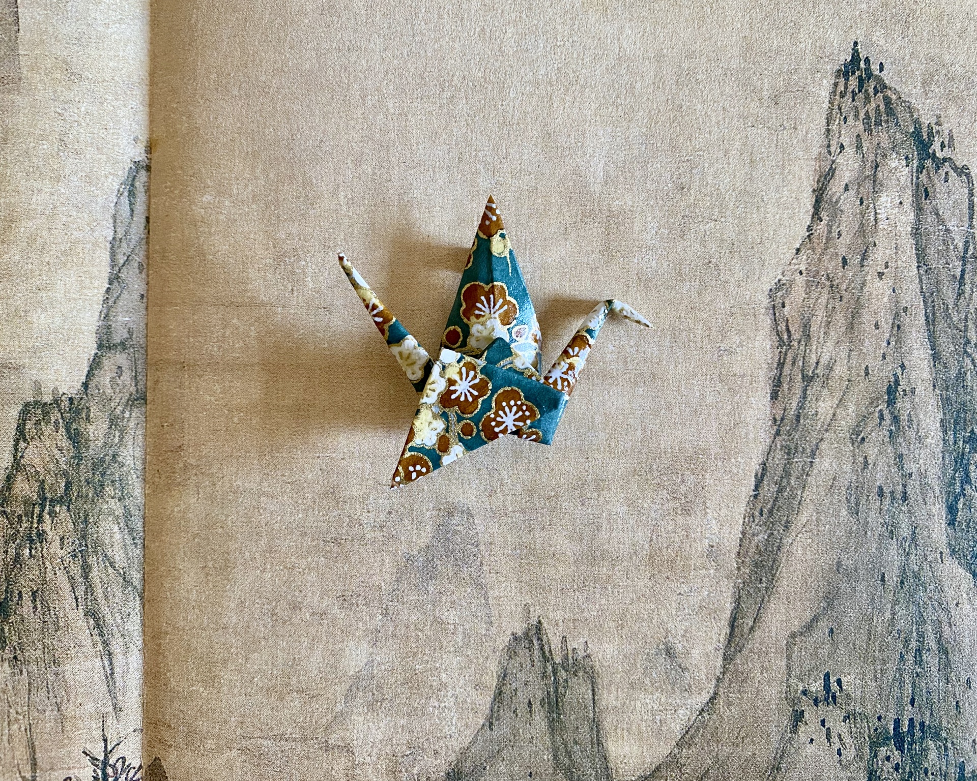 • Grua de origami com padrão floral sobre tecido bege com desenho de montanhas