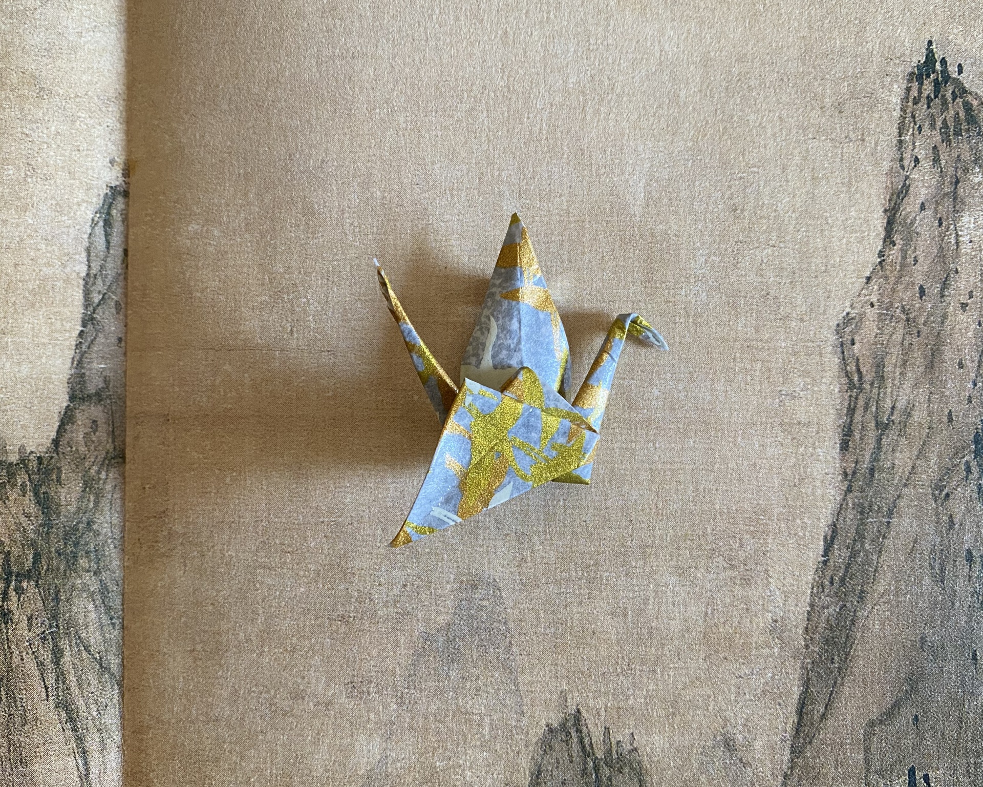 • Pássaro de origami azul e dourado sobre tecido bege com padrão