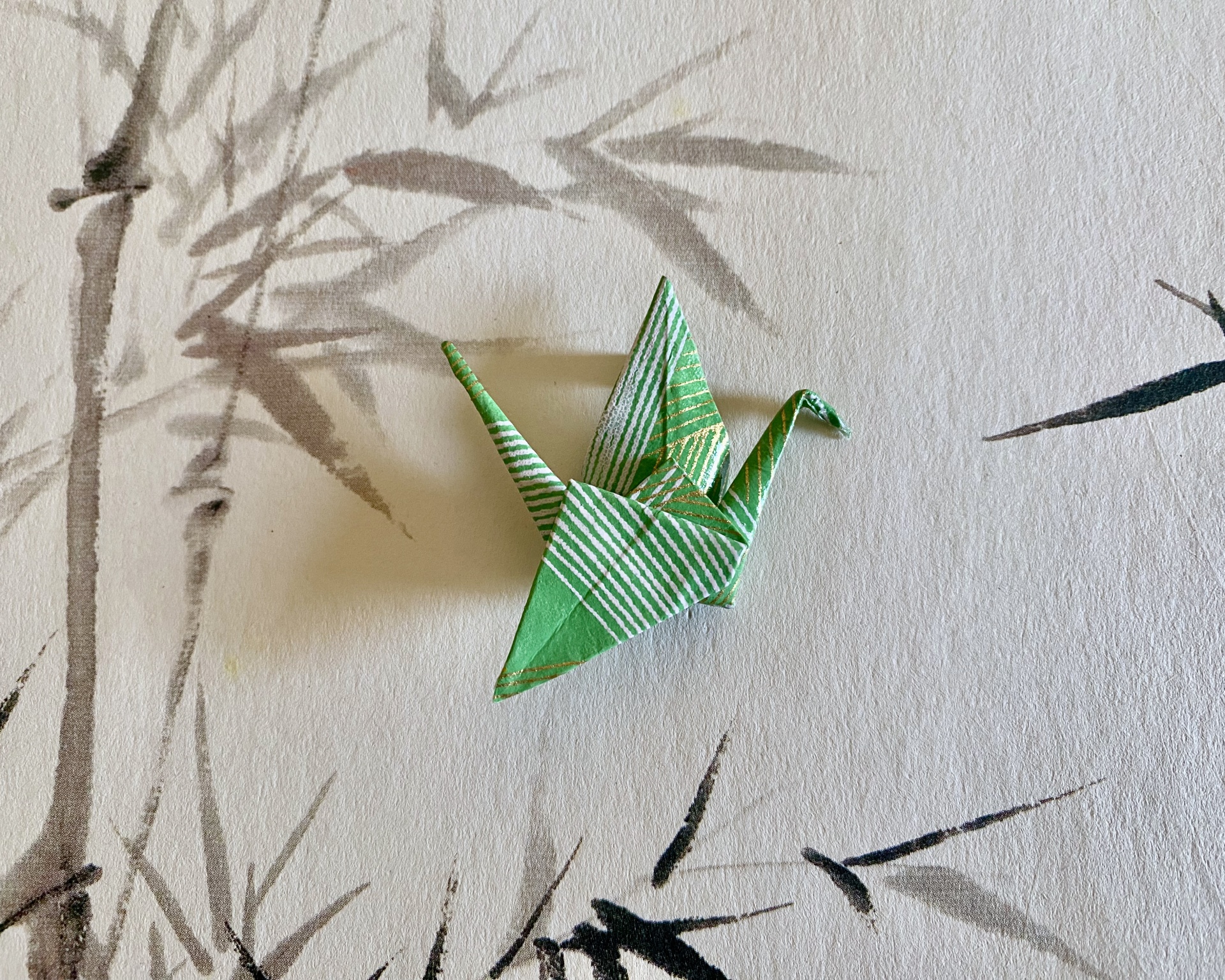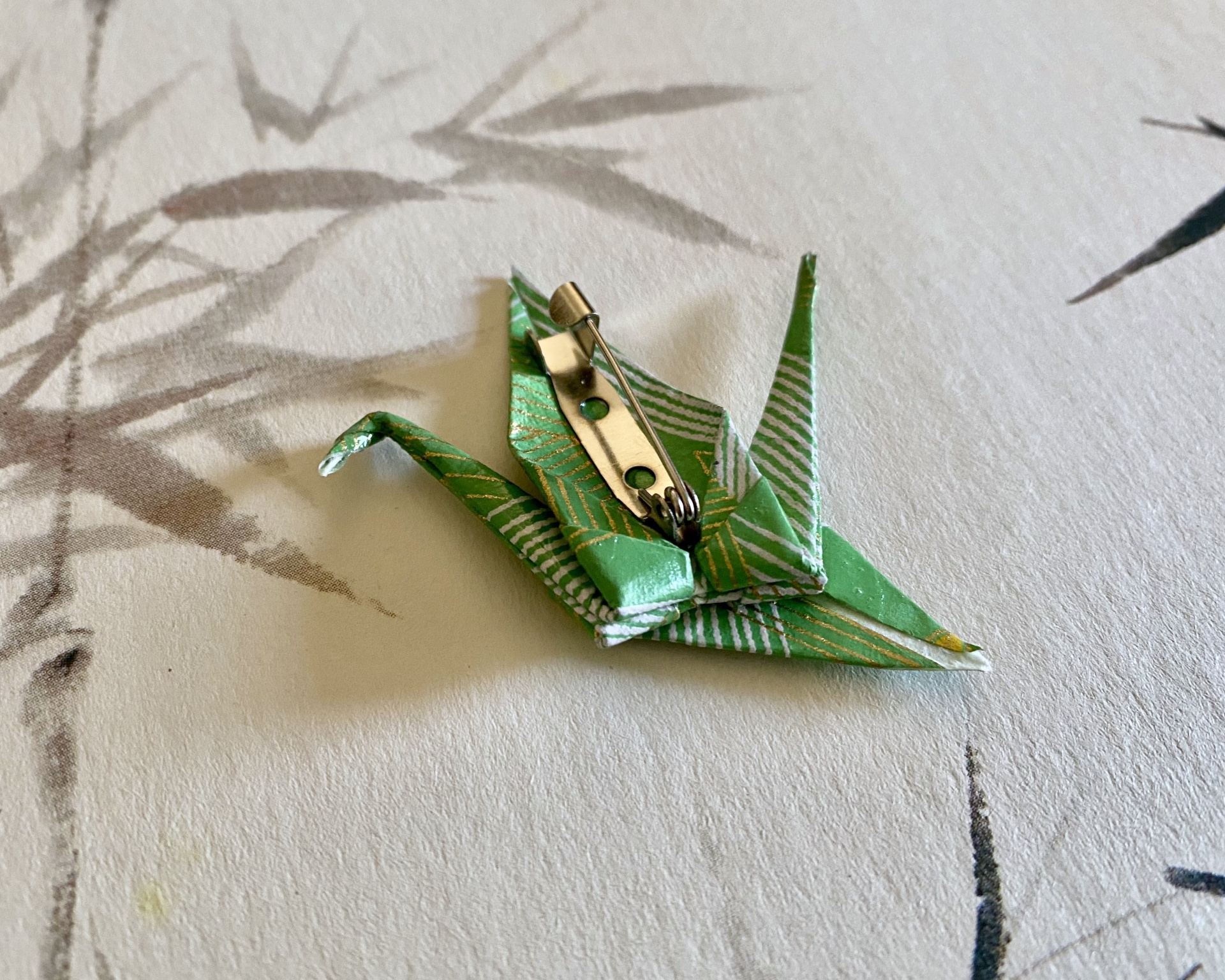 • Broche de origami em forma de grua verde com fecho metálico numa superfície branca com padrão de bambu.