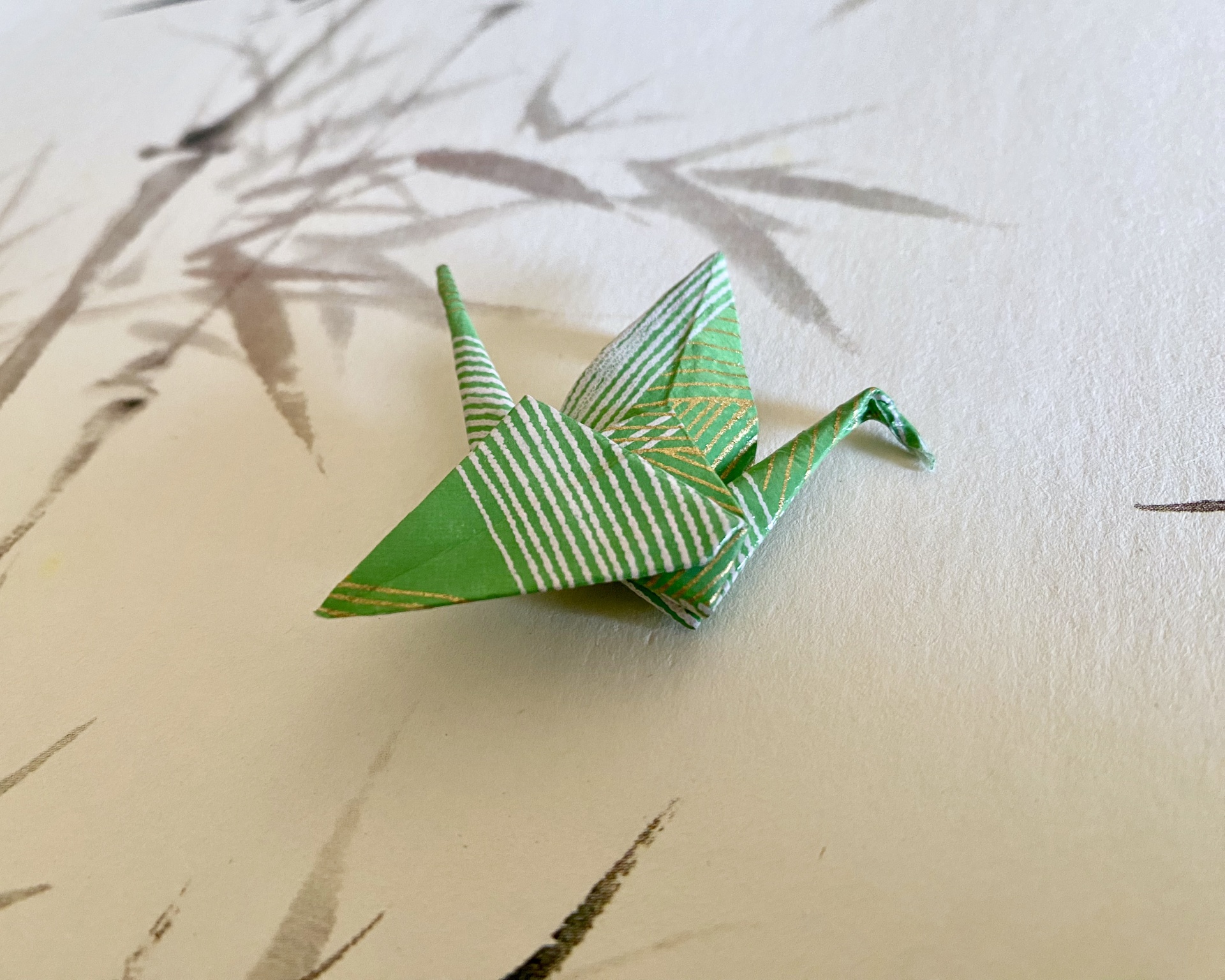 • Origami de garça verde com riscas brancas e douradas sobre superfície branca com folhas cinza.