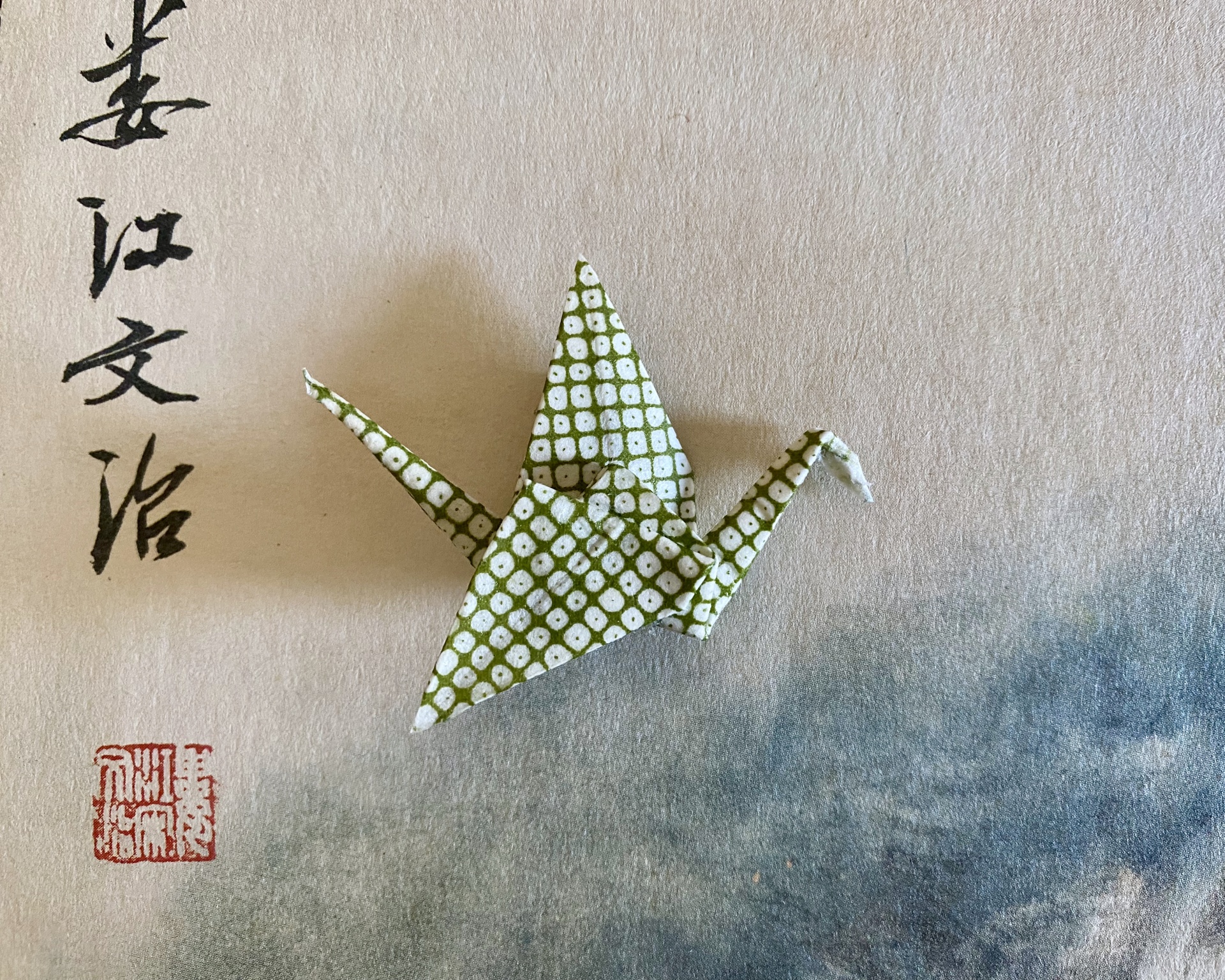 • Origami de pássaro em papel com padrão verde sobre papel com escrita chinesa.